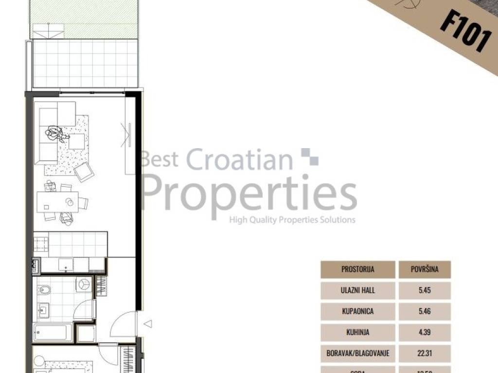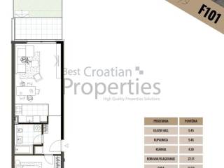 Ovaj funkcionalan i svijetao dvosoban stan s vrtom od 58.54 m2 (oznake F 101) nalazi se u prizemlju stambene zgrade.Po ulazu zgrade gdje se stan nalazi ima pet stambenih jedinica, što samo stanovanje čini ugodnim i obiteljski orijentiranim.Konstrukcija zgrade je armirano betonska, te je projektirana za veliku otpornost od potresa.Stan se sastoji od dnevnog boravka s kuhinjom i izlazom na natkrivenu terasu i pripadajući vrt, predsoblje, spavaće sobe i kupaonice. Uz stan je obvezna kupnja jednog parkirnog mjesta (15.000,00 ).