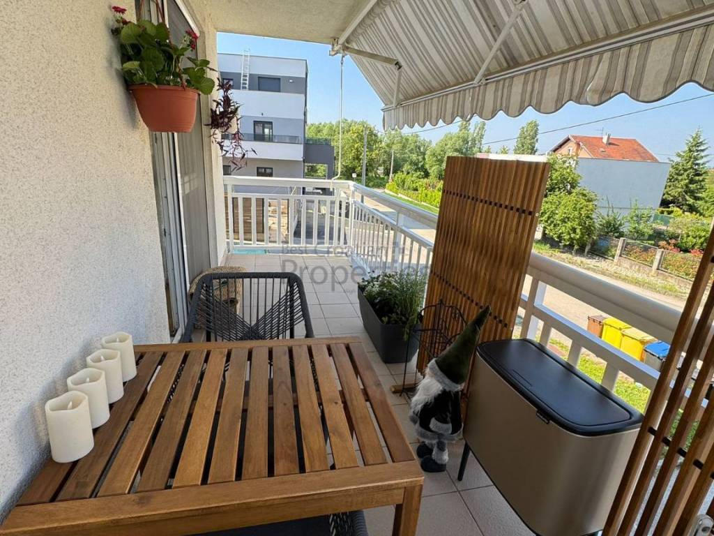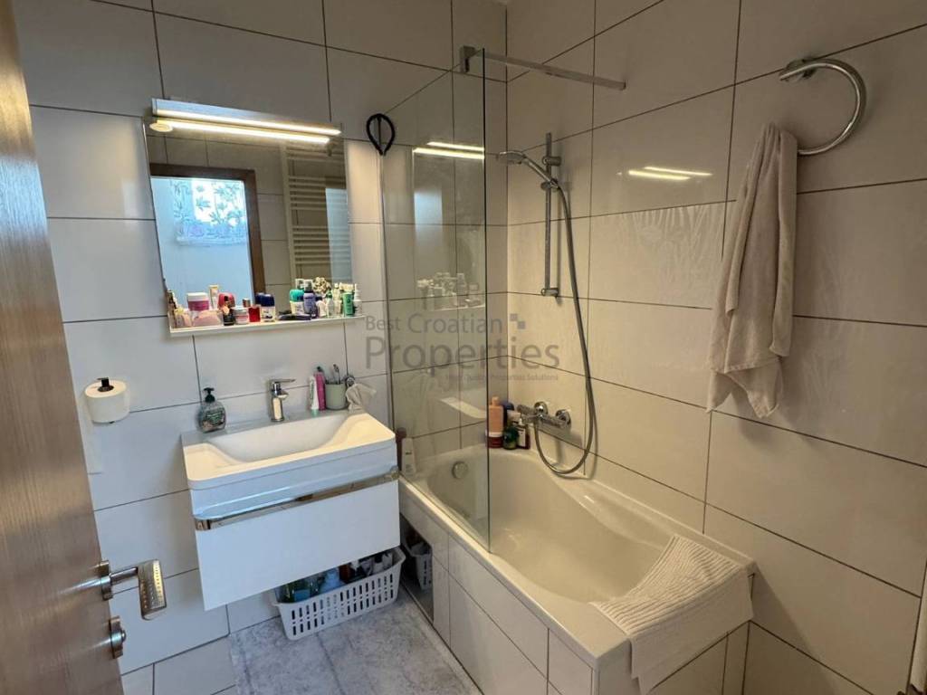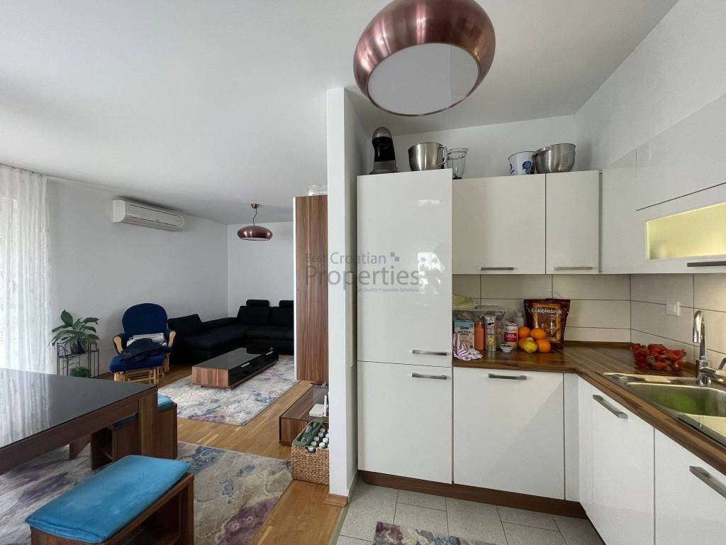 Stan ima 78m2 i sastoji se od ulaznog prostora,dnevnog boravka s kuhinjom i blagovaonom, dvije spavaće sobe, kupaonice i velikog balkona.