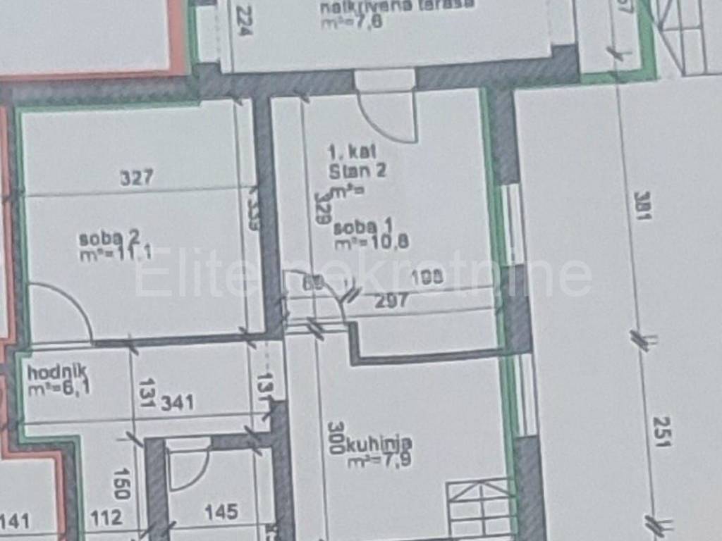 An apartment for sale in a house on the 1st floor of 59 m2 of living space, consisting of a kitchen with a dining room, two bedrooms, a bathroom, a hallway, a staircase and a covered part of the terrace with an area of 59 m2, and an entrance, a storage room and a hallway with a staircase on the ground floor, total area of 20 m2.
