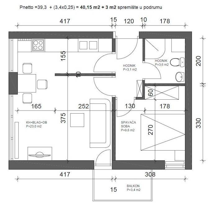 Sastoji se od ulaznog hodnika, kupaonice s kadom, kuhinje, dnevnog boravka s izlazom na balkon, spavaće sobe i spremišta u podrumu.