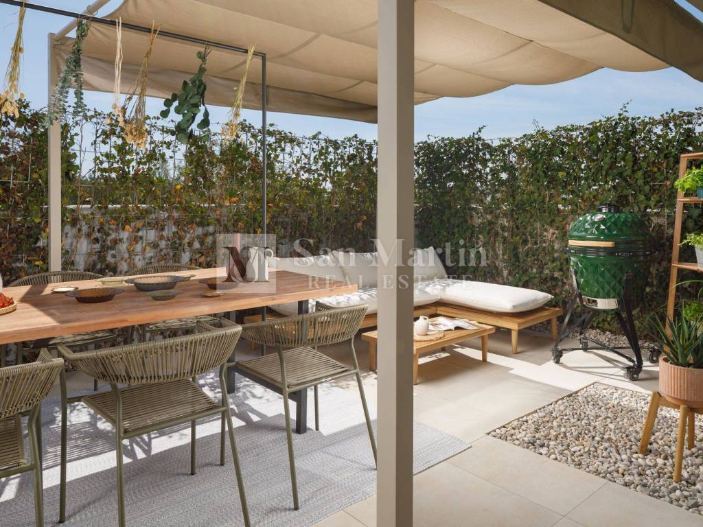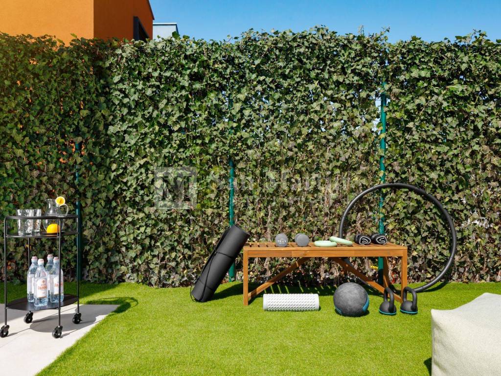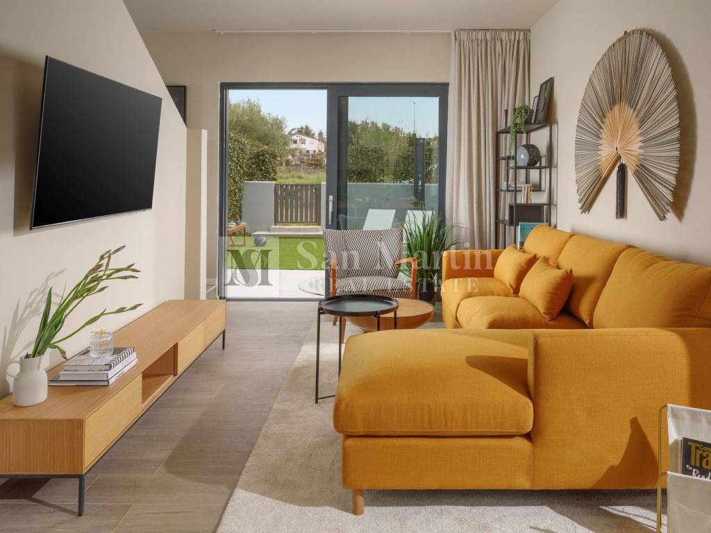 The living room of this beautiful new building has access to the fenced, well-kept garden, where there is a relaxation zone.