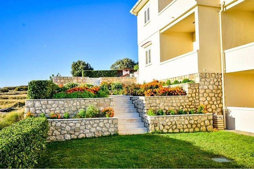 The yard is decorated in Mediterranean style, surrounded by natural stone walls with Mediterranean vegetation.