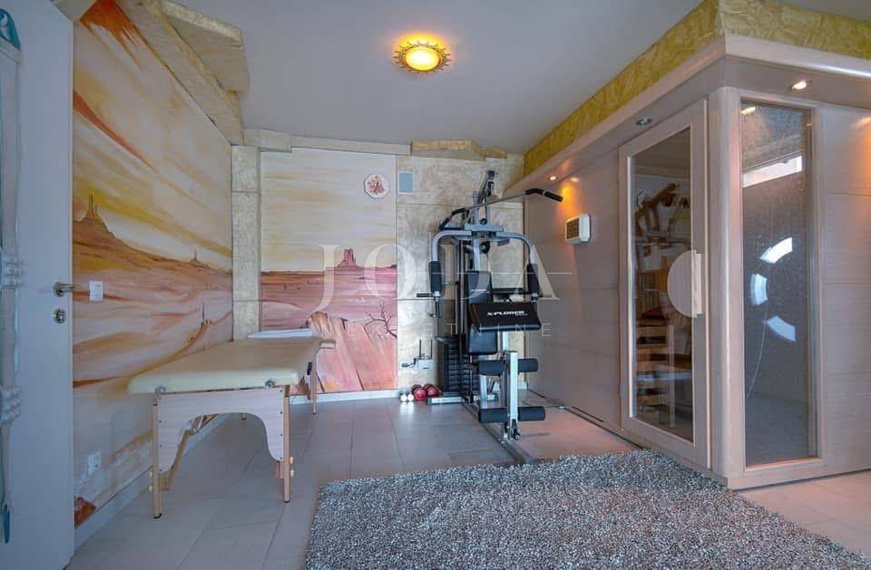 A special highlight is the wellness facilities the house features a swimming pool with counter-current swimming and 27 hydromassage jets, a Finnish sauna, and a private gym. Additionally, there is a social room with a kitchen, two laundry rooms, an ironing room, a pool machine room, and a basement.