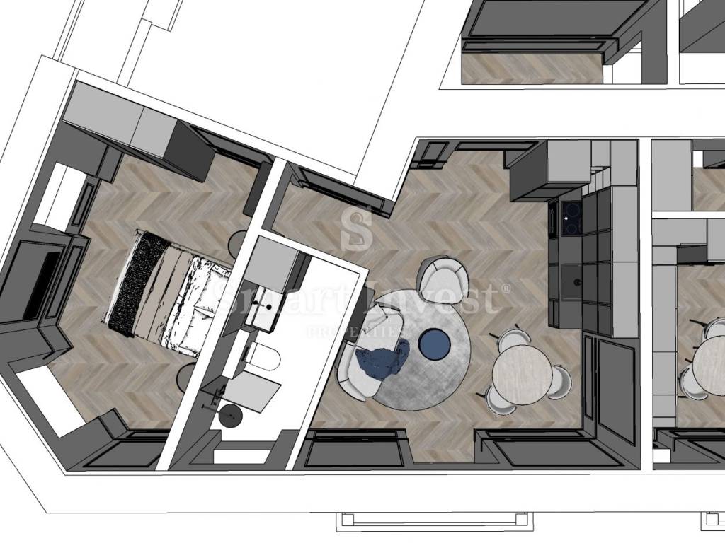 Apartment number 2, fully furnished with designer furniture, is located on the 1st floor of a building with an elevator.