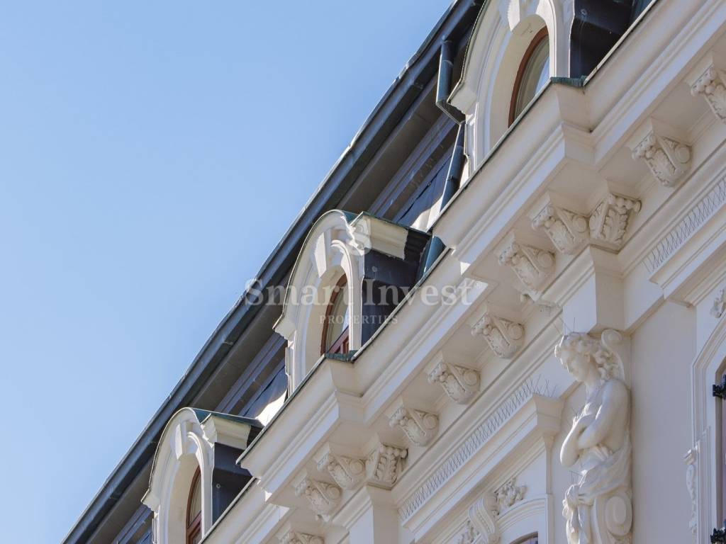 The corner balcony of the first floor, connected by three columns to the balcony of the upper floor, resembles a bay window, and the attic zone, finished with a high vertical copper roof with a dark green patina, is very reminiscent of the recognizable Austro-Hungarian continental architecture.