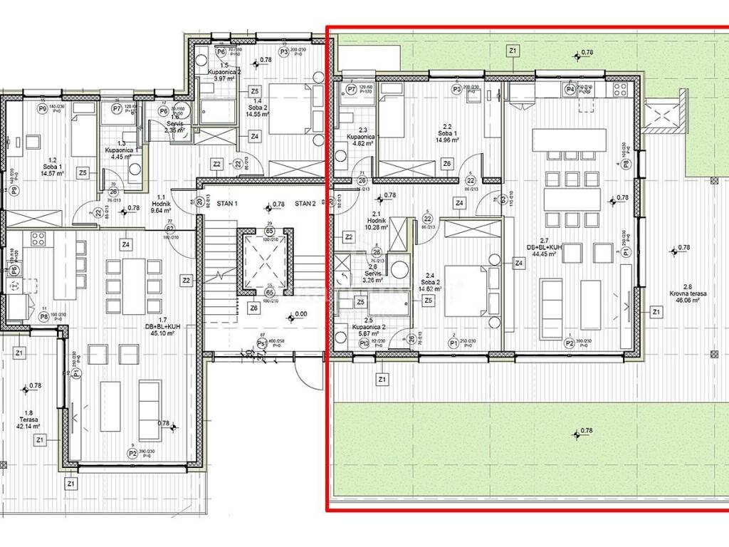 FLAT 2, with a total area of 144.12 m2, is located on the ground floor and consists of an entrance hall, a storage room, two comfortable bedrooms, two bathrooms, a spacious living room with a kitchen and dining room, and a spacious terrace of 46.10 m2.