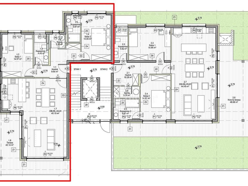 Apartment 1, with a total area of 136.77 m2, is located on the ground floor and consists of an entrance hall, utility room, two comfortable bedrooms, two bathrooms, a spacious living room with kitchen and dining room, and a spacious terrace of 42.14 m2.
