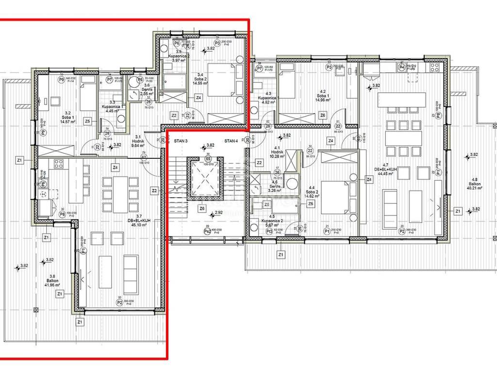 FLAT 3, with a total area of 136.59 m2, is located on the 1st floor and consists of an entrance hall, a storage room, two comfortable bedrooms, two bathrooms, a spacious living room with a kitchen and a dining room with access to a large balcony of 41.96 m2 from which there is a beautiful view of the sea.