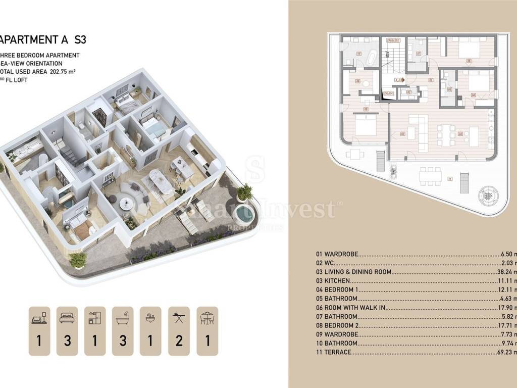At your disposal are an entrance hall, toilet, living room with kitchen and dining room connected to a spacious terrace with a beautiful sea view, master bedroom with en-suite bathroom and walk-in wardrobe, and two more comfortable bedrooms with en-suite bathrooms. The apartment also has 2 garage parking spaces.
