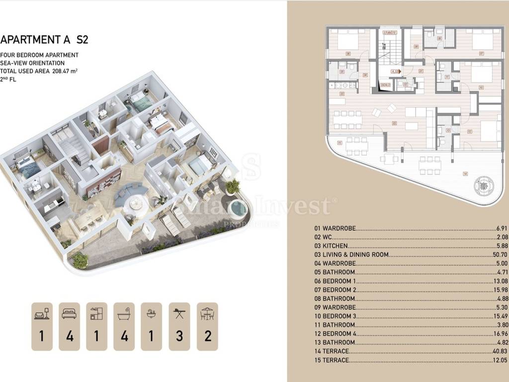 At your disposal are an entrance hall, toilet, living room with kitchen and dining room connected to a spacious terrace with a beautiful sea view, master bedroom with en-suite bathroom and walk-in wardrobe, two comfortable bedrooms with en-suite bathrooms, one more bedroom, bathroom, wardrobe. The apartment also has 1 garage parking space.