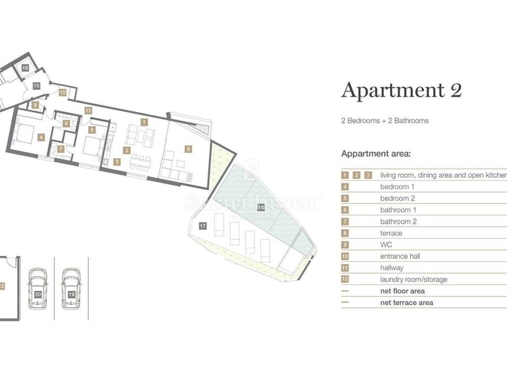 You have at your disposal an entrance hall, toilet, spacious living room with kitchen and dining room connected to a spacious terrace, two comfortable bedrooms with en-suite bathrooms. The apartment also has a storage room, one garage parking space and one outdoor parking space.