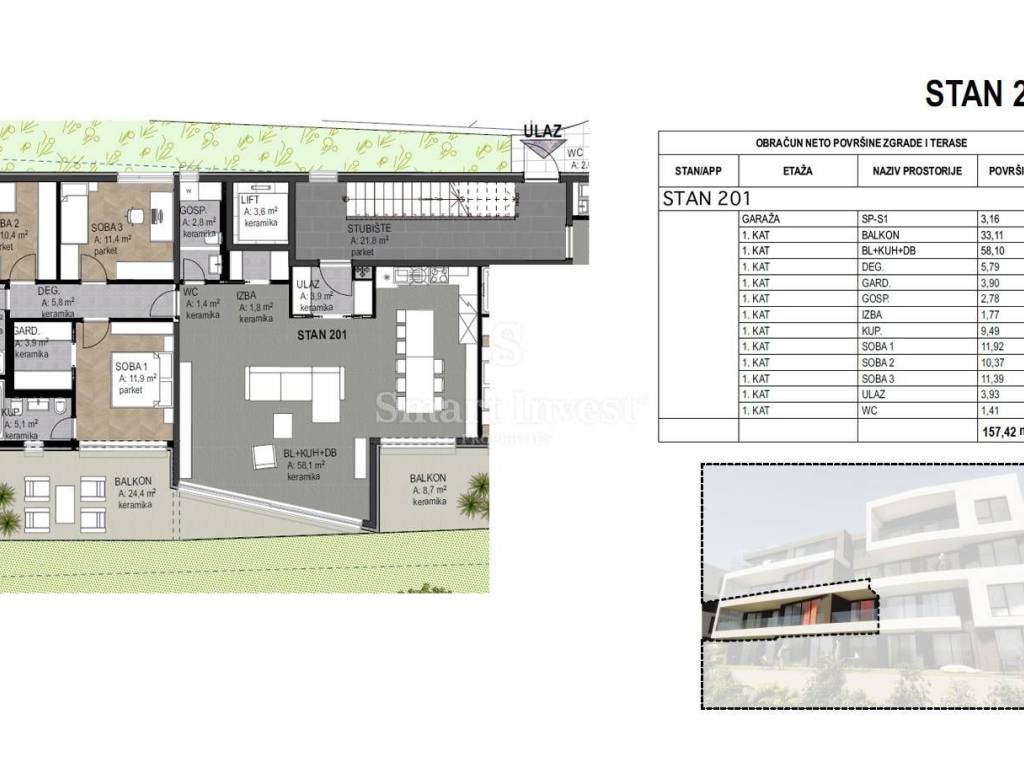 APARTMENT S201 with a total net area of 175.42 m2 is situated on the 1st floor and consists of an entrance, storage room, toilet, utility room, spacious living room with kitchen and dining area, corridor, master bedroom with en-suite bathroom and dressing room, 2 more bedrooms with a shared bathroom, and two balconies. The apartment also has a storage room and 2 parking spaces in the garage, which all makes the total net area of 175.42 m2.