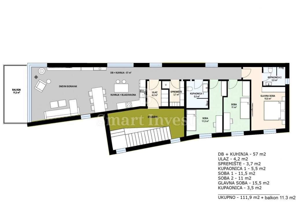 Apartment E2 with an area of 123.2 m2 is situated on the 1st floor and consists of an entrance corridor, 3 bedrooms, 2 bathrooms, spacious living room with kitchen and dining room with access to a balcony of 11.3 m2, storage room. The apartment has a parking space in the garage + an outdoor parking space.
