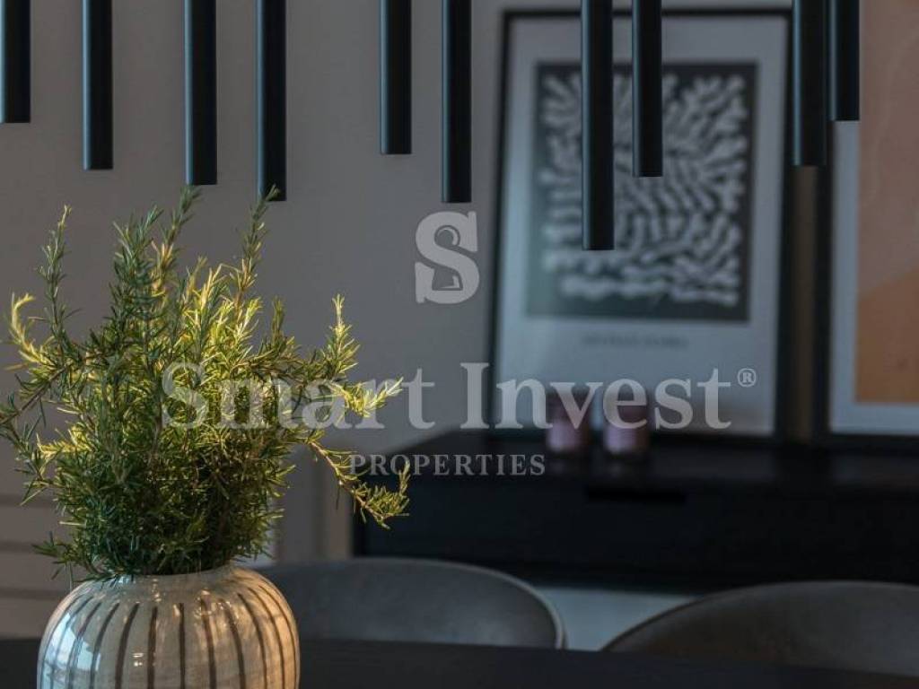 The interior decoration is contemporary, earth tones and colors prevail, and the apartment is sold completely furnished. Heating and cooling is via air conditioning.