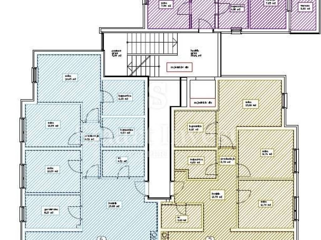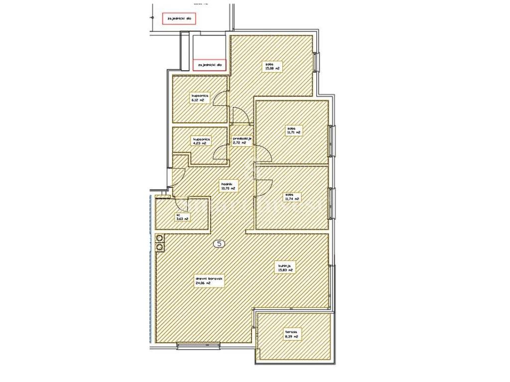 Сonsists of a corridor, living room with kitchen, anteroom, 3 bedrooms, 2 bathrooms, toilet (total area 105.51 m2). The apartment has also a terrace of 10.27 m2, an upper parking space P5G, a lower parking space P5D and a storage room S5 in the basement with a total area of 27.74 m2, which all together with the living area makes a gross area of 143.52 m2.