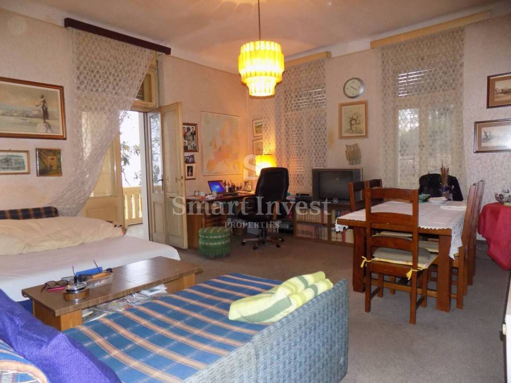 The apartment is situated on the ground floor of the old villa, has a balcony, a terrace, a view of the sea, and a garden.