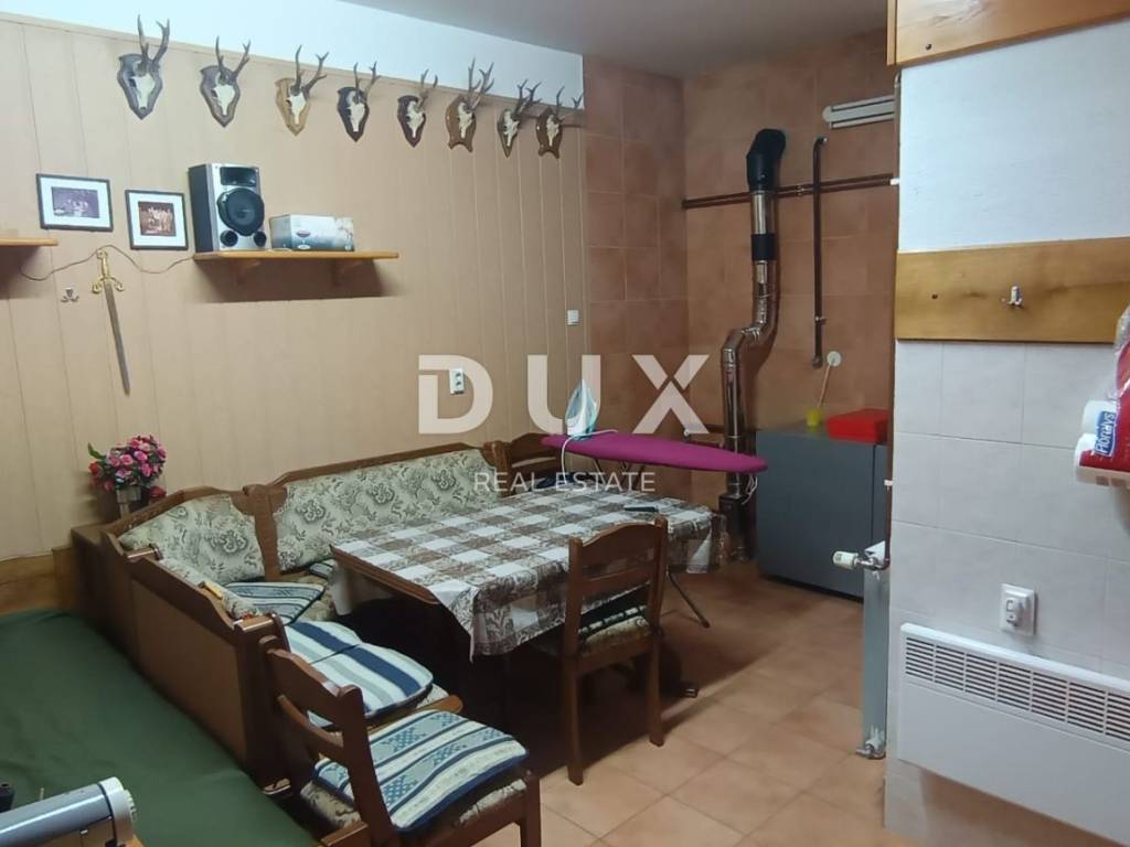 On the first floor, there are two bedrooms, a kitchen, a bathroom, a separate guest toilet and a spacious living room with access to the terrace. A log lift for the fireplace has been installed, and the entire floor is fully furnished and ready to move in.