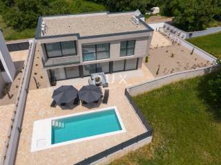 Bribir is a village in Croatia. It is located between Novi Vinodolski and Crikvenica, in the Vinodol municipality. The road to Bribir from the sea leads along the so-called "Paradise Valley". Bribir is the largest village in the Vinodol municipality, located in the interior of the Vinodol valley, 6 km from the sea. The town is also its administrative, cultural and economic center. Built on a hill above the Vinodol valley, in the Middle Ages it was the center of the Vinodol region, which developed around a fortress, a castle built by the Frankopans in 1302 and demolished in the 19th century, of which only a square tower with part of the walls has been preserved to this day. Bribir is a town with a rich cultural tradition, sacral and historical heritage. We are selling a luxury villa with a swimming pool in an excellent microlocation. In fact, these are two villas, identical, next to each other and both are for sale. It consists of a ground floor and an upper floor. It is designed so that the ground floor is the living area, and the first floor is designed as the sleeping area. The ground floor of the villa consists of an entrance hall, kitchen with dining room, living room, and bathroom. The ground floor is completely glazed, so that from all parts you can go out to the covered terrace. Internal stairs lead to the sleeping area, three bedrooms, each with its own bathroom, and two terraces. The outdoor area consists of a sundeck and swimming pool. The house was built in 2024. High-quality materials were used during construction, both for the construction and for furnishing the villa. Underfloor heating is installed throughout the house. The ground floor has two ceiling air conditioners, while each room on the first floor has a KIMA unit. The house is categorized and is successfully rented on the tourist market. A very interesting property worth noting.