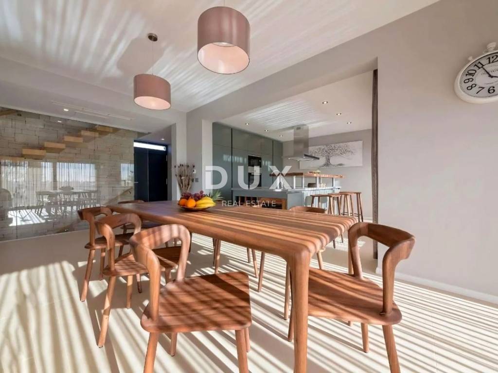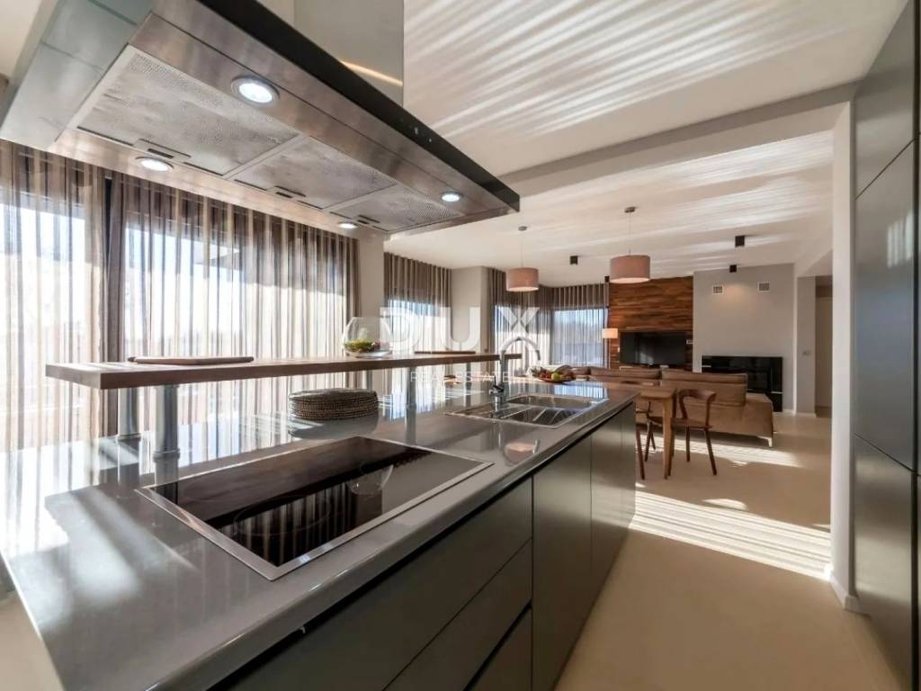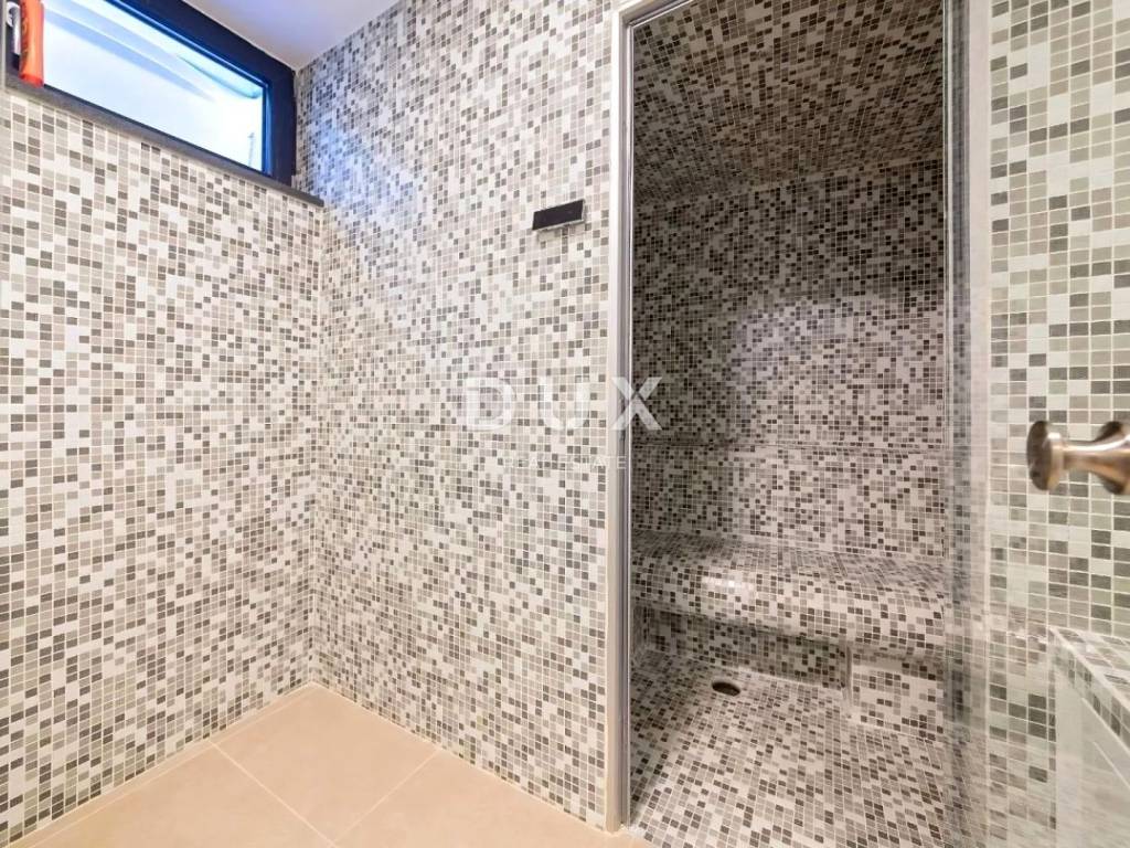 Bathed in a pleasant Mediterranean climate, located in the heart of the western Istrian coast, the ancient town of Poreč and its coastline of preserved natural beauty, landscaped parks, pine and oak groves that reach the sea itself, along which the clear sea, beaches, bays and islands alternate, spreads over an area of 139 km and consists of 58 settlements. With the identity of an urban coastal city, Poreč is a city of culture, sports, entertainment, a city of tourism and true hospitality. One of the most attractive cities of Croatian tourism that uniquely combines the natural beauty of Istria, a rich cultural and historical heritage and the most modern amenities of a top tourist destination. The harmony of the old town core, which is a cultural monument, with one of the most famous Istrian cultural monuments, the Euphrasian Basilica, which is on the UNESCO World Heritage List, and the most well-maintained and best-equipped tourist settlements on the Adriatic, forms a mosaic of unforgettable experiences. Poreč is also a city that is much more than a summer destination of sun and sea. Poreč is a city tailored to the needs of a person. A city in which there is a constant impulse to improve living conditions and make progress in various spheres greater. A city that is a pleasant, safe and well-maintained place to live where everyone can find their place, a city without surtaxes with high social sensitivity for all generations. In an attractive suburb of the city of Poreč, a modern house with a swimming pool near the sea is for sale. It is located in a quiet neighborhood, surrounded by family houses and holiday homes, offering a perfect balance of proximity to the sea and urban amenities. The semi-detached house, with its architecture, fits into the settlement and landscape in terms of form and color, and creates a synergy of natural surroundings and modern design, while the quality of construction guarantees long-term satisfaction and quality of living. It is defined as one residential unit whose area is distributed over three tastefully decorated floors of a functional floor plan and a roof terrace. In the basement there is a gym with fitness equipment, two saunas (Finnish and steam bath) and a shower. The ground floor consists of an open-concept space that unites the kitchen, dining room and living room with access to a covered terrace, a guest toilet and a laundry room. The first floor consists of three bedrooms with private bathrooms, two terraces and a hallway that provides access to a spacious roof terrace with a hot tub via an internal staircase. The yard is landscaped and fenced, and the perfect harmony is complemented by a swimming pool with a sunbathing area. The excellent location and spatial organization of the interior and exterior of this property provide an opportunity for a comfortable family life or an investment in a tourist rental business.