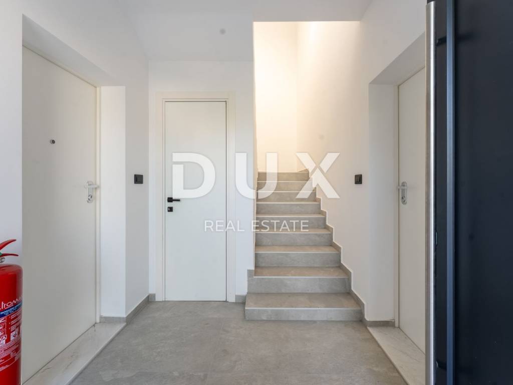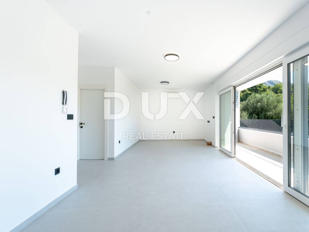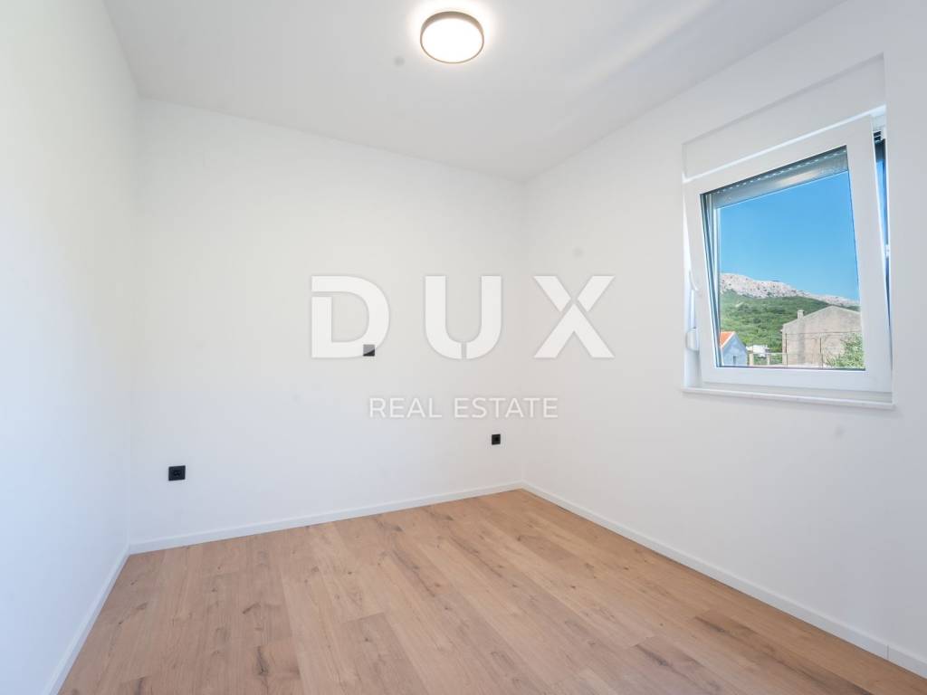 In the vicinity of Baška, 4 km from the sea, an apartment is for sale in a new building, modernly designed and built to a high standard. The new building consists of four residential units, and is located on the edge of the green zone, surrounded by olive groves. The apartment is located on the 1st floor of the building, living area 61.99 m2, and consists of an "open-space" kitchen with dining room and living room, two bedrooms and one bathroom. From the living room there is a covered terrace of 10.33 m2. The apartment is oriented to the south, it has two parking spaces in the common garden. The carpentry is aluminum, with electric shutter lifters, the entrance door is anti-burglary. The air conditioners will be Daikin, and the outdoor units will be hidden. Exceptionally high-quality materials, modern sanitary ware, ceramics and other coverings were used during construction. The buyer is exempt from paying real estate sales tax.