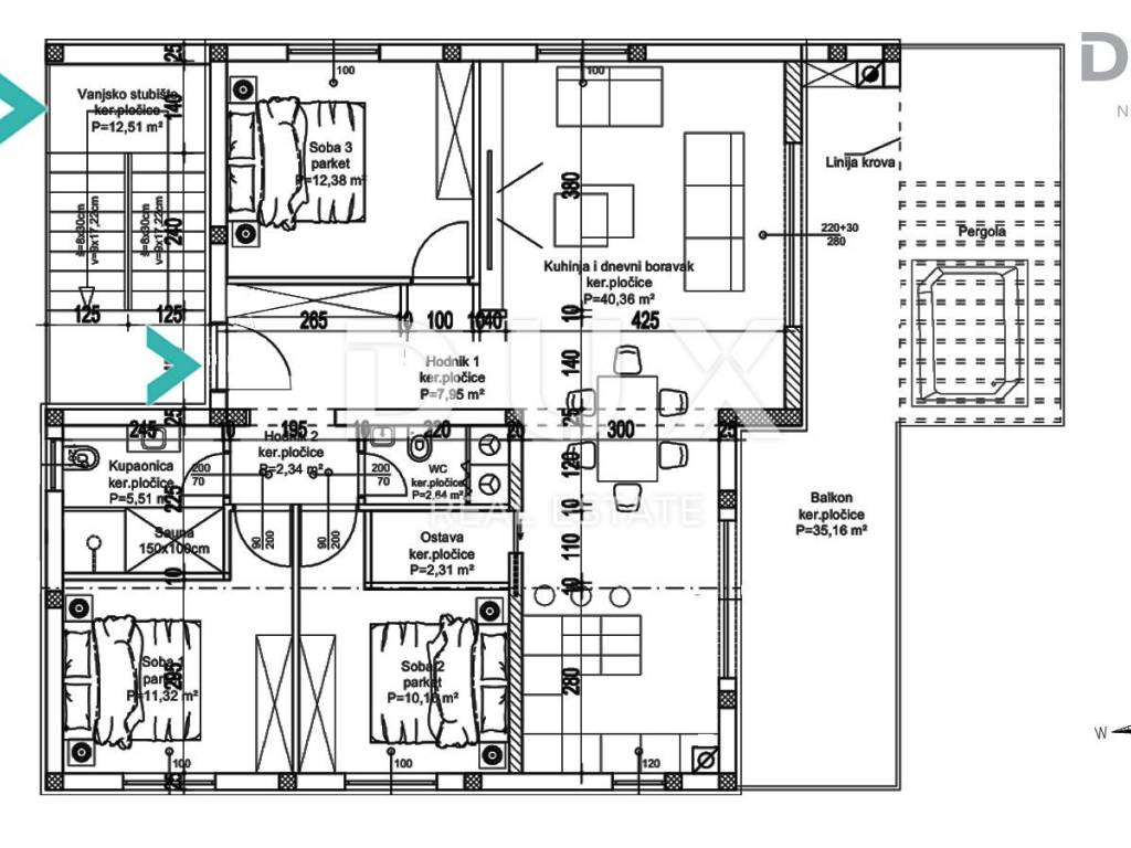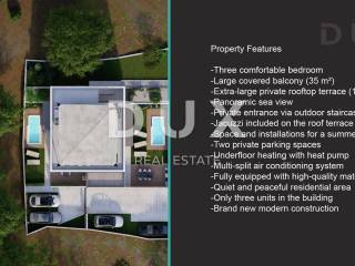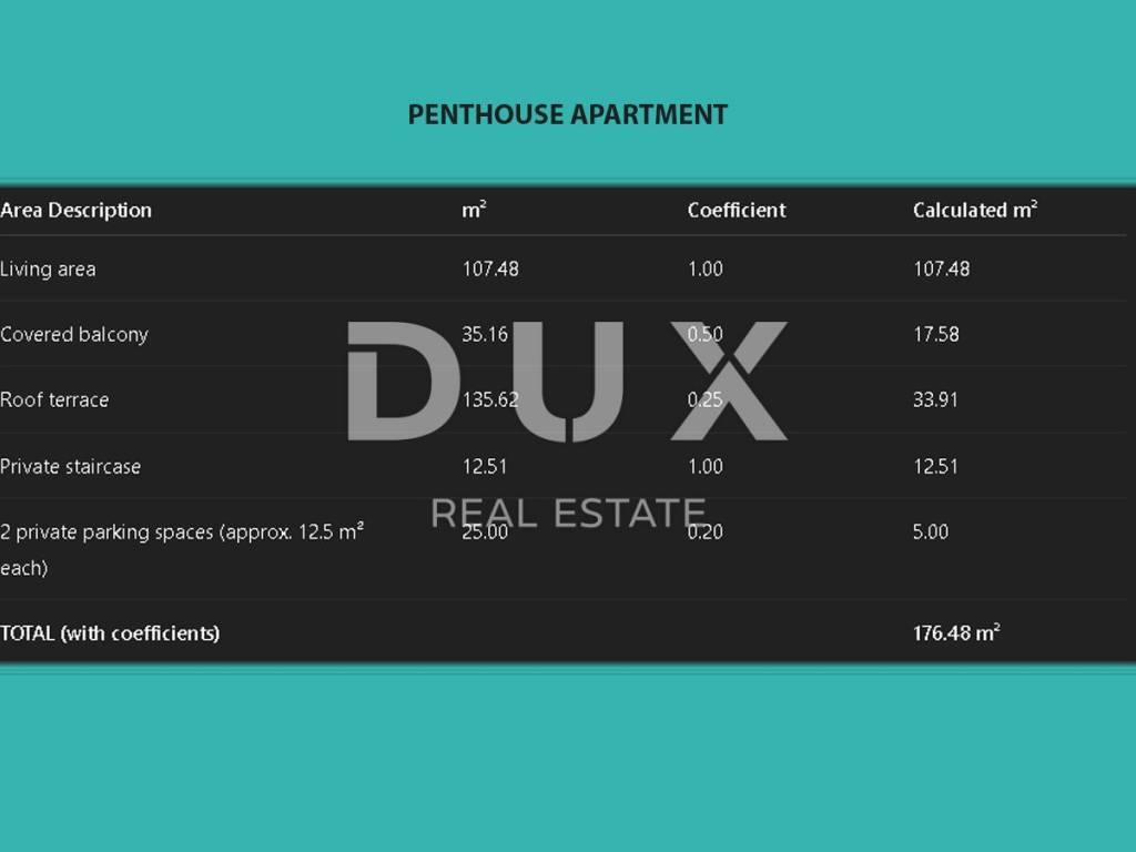 We are offering for sale an exclusive penthouse in a new building in an exceptional location in Ika, only 500 meters as the crow flies from the sea. This unique property is located on the top floor of the building and has a separate access via its own external staircase. The apartment is designed for a comfortable and quality stay throughout the year, while at the same time offering luxury, functionality and complete privacy - something that is very rarely found on offer. The apartment consists of a spacious living room with kitchen and dining room of 40.36 m2, three bedrooms, bathroom, additional toilet, two hallways, storage room and a covered balcony of 35.16 m2. In addition, the apartment has a spacious roof terrace of 135.62 m2 - designed as an extension of the living space under the open sky. The exceptional roof terrace features a bioclimatic pergola of approximately 30 m2, a space for a summer kitchen with all necessary installations and a jacuzzi or swimming pool, which turns this terrace into a private oasis perfect for enjoying, socializing and relaxing with an open view of the sea. The apartment is equipped with underfloor heating, a heat pump and multisplit air conditioning, which allows for complete comfort throughout the year. Thanks to the carefully designed layout, the apartment offers enough space for a comfortable stay for up to six people. The apartment also comes with two private parking spaces. The total calculated area is 176.48 m2 (including coefficients for the balcony, roof terrace and parking spaces). This combination of size, content, location and quality of execution represents an exceptional opportunity on the market and a rarity in this part of the Opatija Riviera. The distance to the sea is 500 meters as the crow flies, while the ACI marina Ičići is only a few minutes' easy drive away. The center of Opatija can be reached in approximately 10 minutes by car. Total internal living area: 107.48 m Covered balcony: 35.16 m (calculated 50% = 17.58 m) Roof terrace: 135.62 m (calculated 25% = 33.91 m) Private staircase: 12.51 m 2 private parking spaces: approx. 25.00 m (calculated 20% = 5.00 m) Total calculated area: 176.48 m For more information and to organize a viewing, please contact the agent.