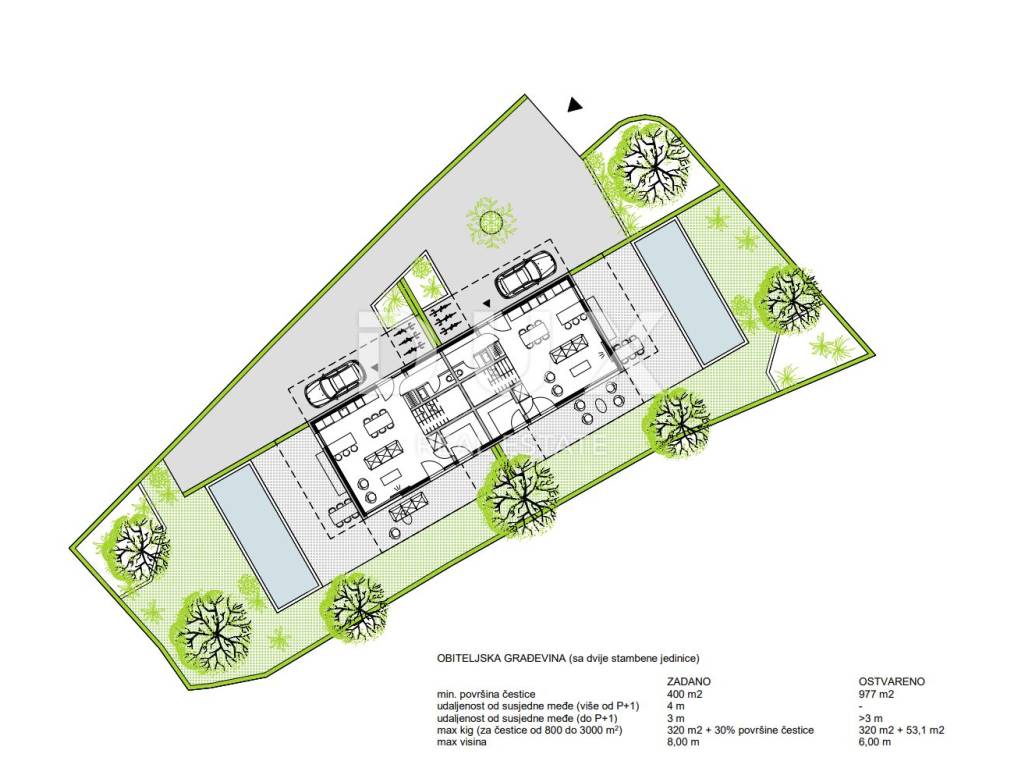 Na prodaju građevinsko zemljište površine 977 m s ishođenom građevinskom dozvolom za izgradnju moderne dvojne kuće s bazenom. Zemljište se nalazi na mirnoj lokaciji u blizini Labina, okruženo zelenilom i netaknutom prirodom, pružajući privatnost i opuštajući ambijent.