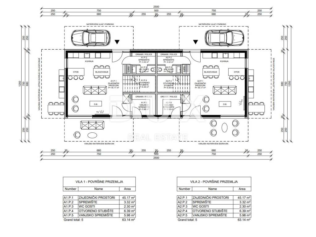 Projekt predviđa ukupnu površinu kuće od 320 m, pri čemu svaka stambena jedinica ima 140 m unutarnjeg prostora te dodatnih 20 m terasa, idealnih za uživanje na otvorenom. Kuće su dizajnirane u suvremenom arhitektonskom stilu, s naglaskom na funkcionalnost i udobnost, dok vanjski prostori uključuju uređeno dvorište i privatni bazen.