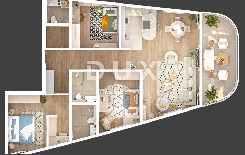 We offer a top-quality apartment located on the fourth floor of a modern luxury new building in an attractive location Kantrida, Rijeka. The building is located in the third row to the sea, just 5 minutes walk from the beach and 10 minutes drive to Opatija, in a quiet and well-maintained environment ideal for living and investment. The apartment (S29) with a total area of 123.90 m consists of: entrance hall (12.14 m), open-concept kitchen, dining room and living room (39.00 m), exit to a 15.67 m balcony with a stunning sea view, three bedrooms, including a spacious master bedroom (18.09 m) with an en suite bathroom (4.45 m), and two additional bedrooms (12.85 m and 11.73 m), additional bathroom (4.20 m). The apartment comes with: two garage parking spaces (no. 67 12.78 m and no. 68 12.50 m), storage room (no. 29 2.71 m).