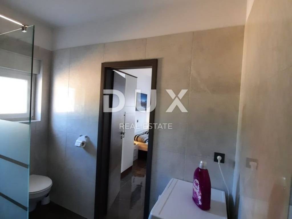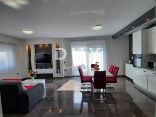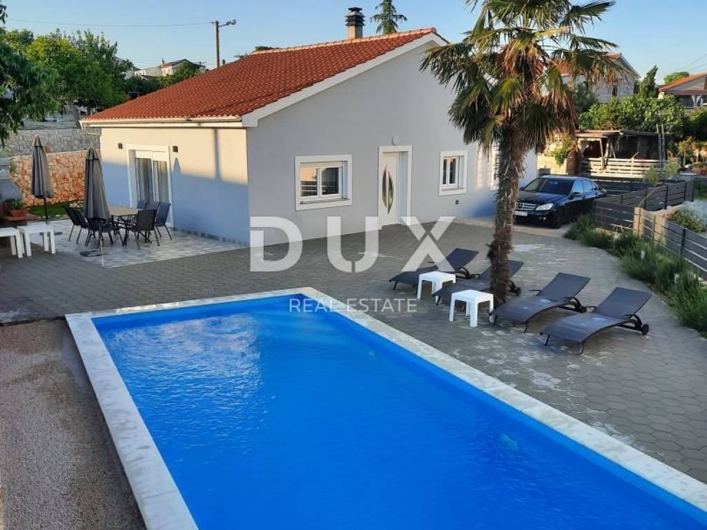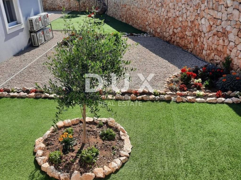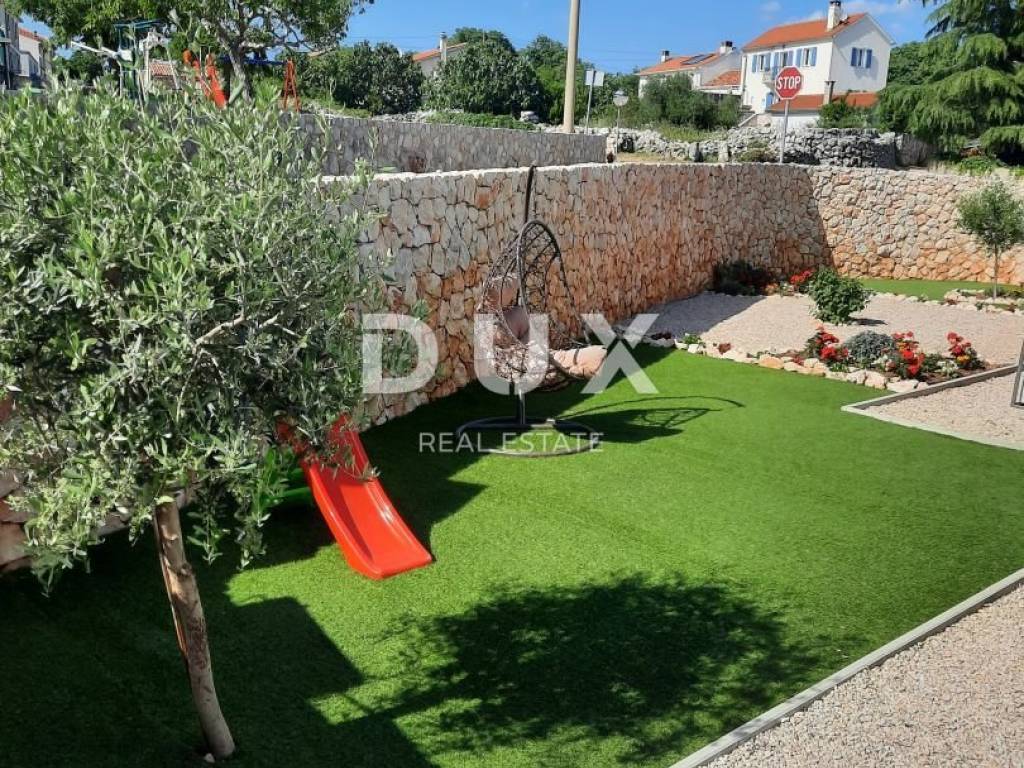 In the heart of the peaceful and authentic Garica, on the beautiful island of Krk, is located this modernly decorated 90 m single-storey house, which represents the perfect combination of luxury, privacy and comfort. Specially designed for a pleasant family life or as an attractive investment for tourist rental, this property offers three spacious bedrooms, each with its own bathroom, a swimming pool with a sunbathing area and a beautifully landscaped courtyard with Mediterranean plants. The main advantage of this house is the three elegant bedrooms, each with its own private bathroom - an ideal solution for families, friends or guests, providing everyone with their own corner of peace and comfort. The central part of the house is designed in an open space concept, where the kitchen, dining room and living room merge into a harmonious and airy whole. Large glass walls allow for plenty of natural light and offer a view of the courtyard with a swimming pool. For complete comfort, the house is equipped with air conditioning, while in the winter months a wood-burning fireplace will further emphasize the warmth of the home, creating a cozy atmosphere. A practical addition is the attic, which can be used as storage space or converted according to needs. The yard of this property is a true oasis of relaxation. On the spacious terrace there is a swimming pool with a sunbathing area, perfect for carefree summer days and evening gatherings. Palm trees and olive trees give this space a special charm, which bring an authentic Mediterranean atmosphere and additional privacy. Garica is an idyllic island village, ideal for those looking for peace and privacy, but also close to all important amenities. Located in the interior of Krk, it offers quick and easy access to beautiful beaches, restaurants and all the attractions of the island. Here you can enjoy untouched nature, cycling and hiking trails and the traditional island lifestyle, while the sea is always within reach. This exceptional property offers everything you need - three spacious bedrooms with private bathrooms, modern design, a swimming pool and a Mediterranean garden. Whether you are looking for a dream home on the Adriatic or a secure investment with great potential, this is an opportunity not to be missed!