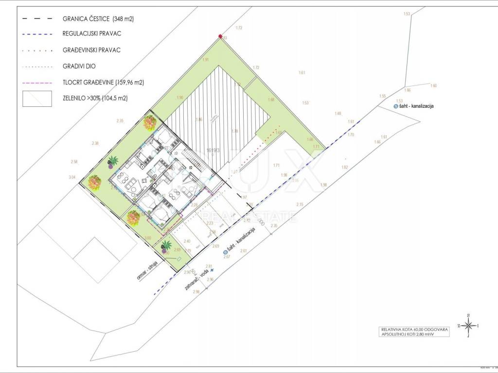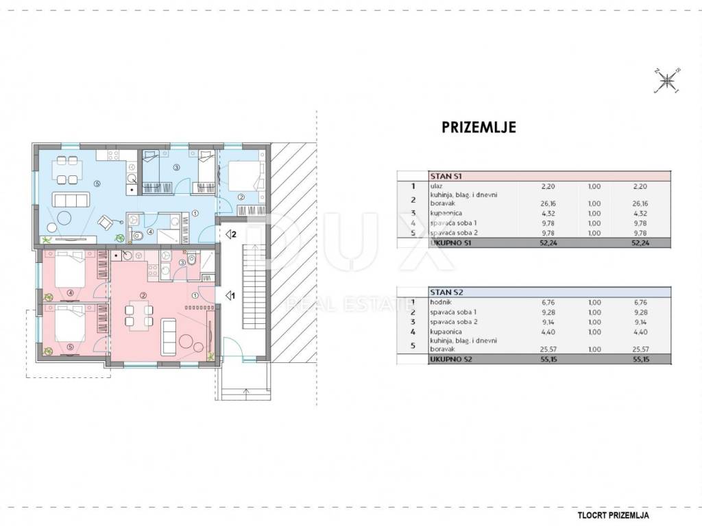 An apartment with a garden under construction in the town of Bibinje near Zadar is for sale. The apartment with a total living area of 52.24 m2 is located on the ground floor of a small residential building with 5 residential units. It consists of two bedrooms, a living room, a kitchen and a dining room and a bathroom. The apartment also has a garden and one parking space in the courtyard of the building. The apartment is air-conditioned, and underfloor heating has been installed. The joinery is PVC with electric shutters, and fire and burglar-proof doors have been installed. The planned completion date of construction is in the second half of 2025. The facility is located in an attractive location near the Sukošan marina, 500 m from the sea. Bibinje is 7 km from the urban center, the city of Zadar, and 14 km from the nearest airport Zemunik. There are also various national parks, nature parks and numerous islands with crystal clear Adriatic Sea in the surrounding area. In the immediate vicinity of Bibinje, for example, there is one of the most famous Croatian national parks, the Kornati National Park, which leaves you breathless with its impressive geography, and consists of as many as 89 islands, islets and cliffs.