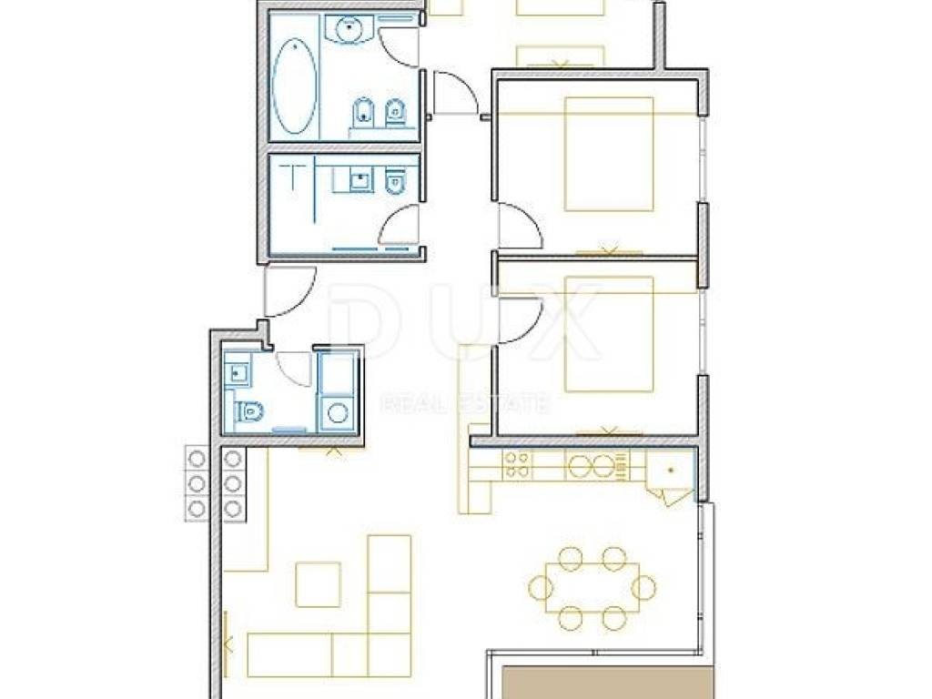 DUX represents a great opportunity to buy a new apartment with a terrace in the center of Opatija. The apartment is located on the 2nd floor of a new building and has two parking spaces in the garage. The size of the apartment is 125 m with coefficients, and it consists of a hallway, an open space living room with a kitchen, three bedrooms, an entrance hall, two bathrooms, and a toilet. This apartment features a sunny loggia (balcony) with a fantastic view and a storage room in the basement.