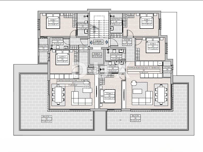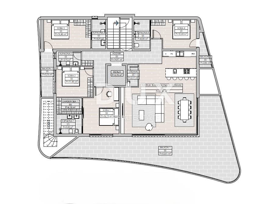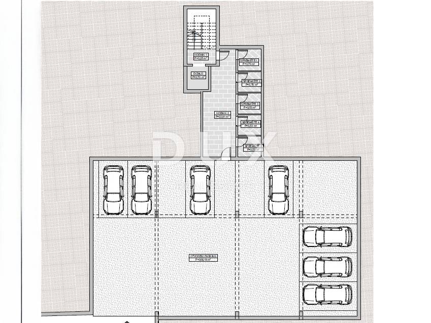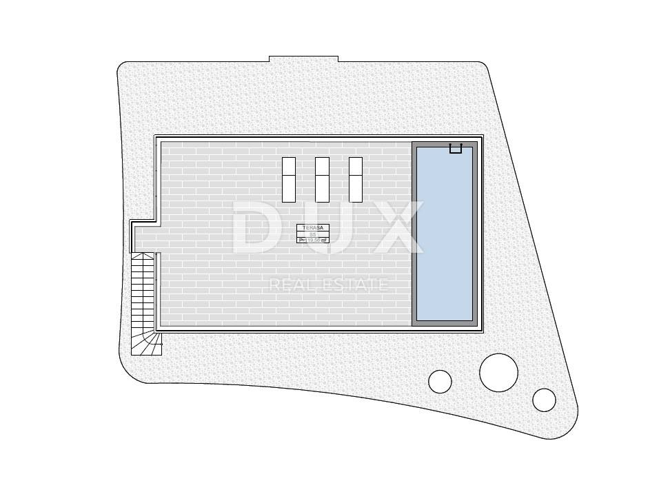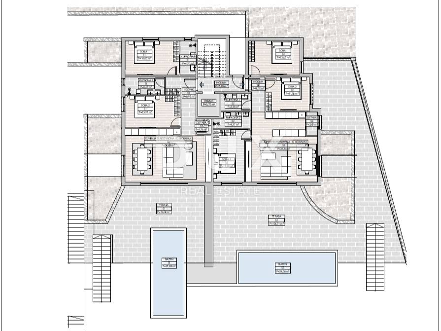 Zgrada je predviđena da ima veću okućnicu i bazene, a zahvaljujući položaju terena, sa svake točke pruža se panoramski pogled na more. Idejni projekt za zgradu sastoji se od garaže, prizemlja i prvog kata gdje se nalaze 4 veća stana te penthouse koji se prostire preko cijelog drugog kata.