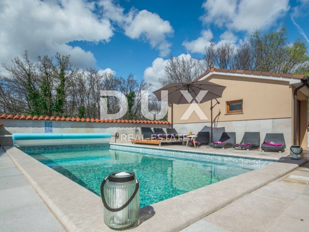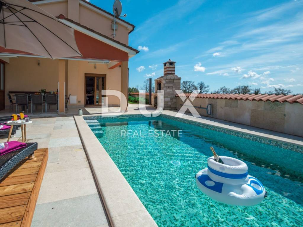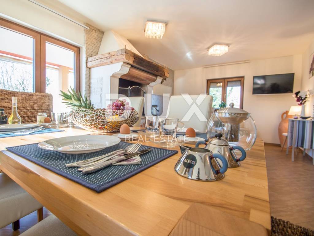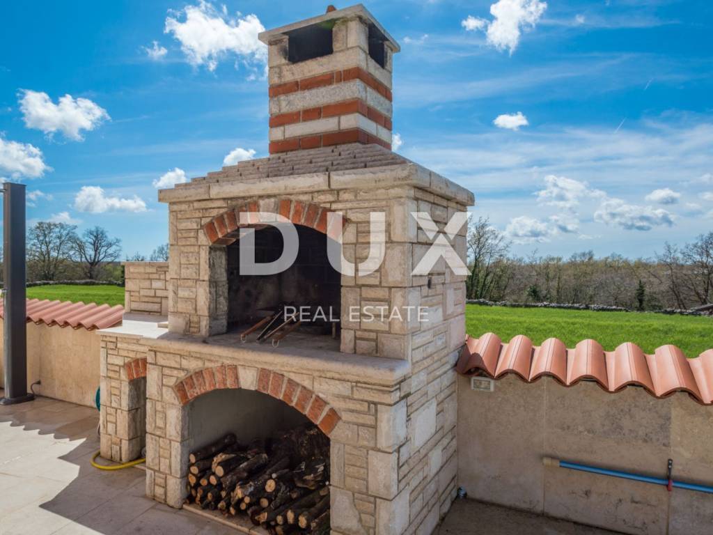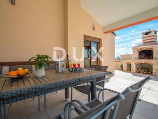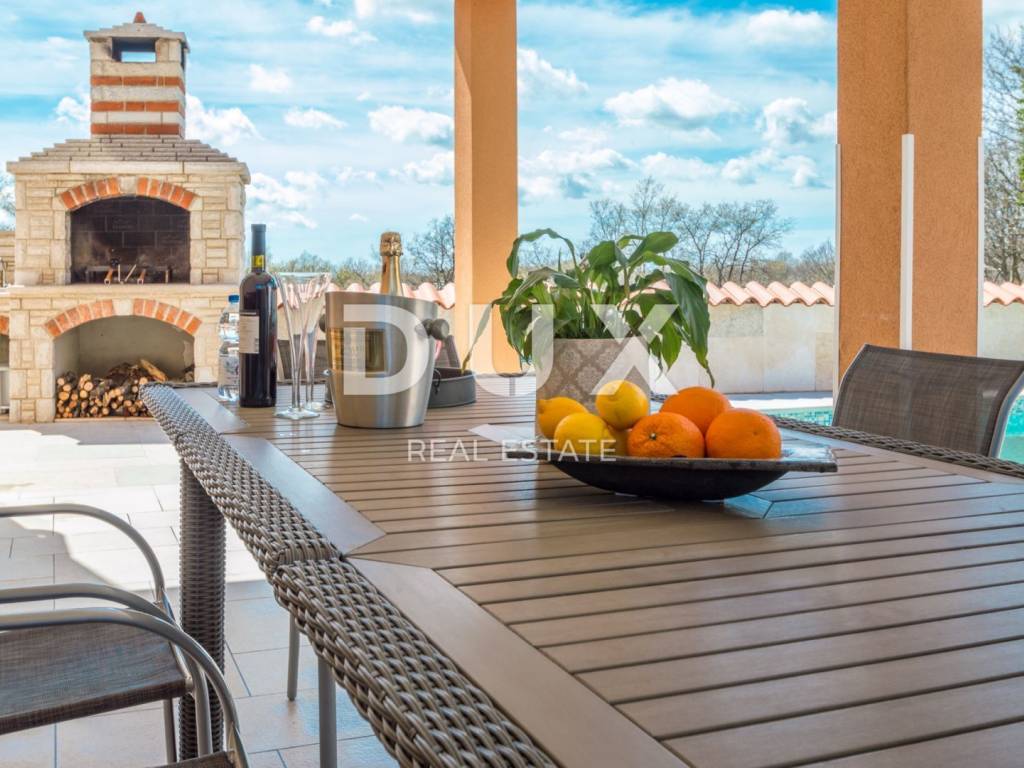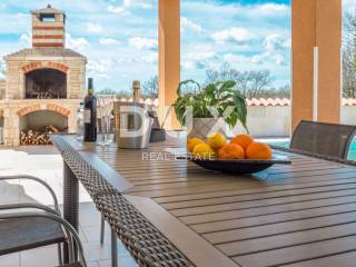 A modern villa with a heated pool is for sale in the area of Marčana. The living area of the villa is 170 m2 and consists of an open space living room with a special atmosphere created by a fireplace, a kitchen with a dining room, four bedrooms and two bathrooms. This villa offers complete peace and intimacy to the future owners, and due to its extraordinary location, it is only 10 minutes from the Pula airport, shops, restaurants, and all the necessary facilities, and it is important to point out that there are bicycle paths in the immediate vicinity. Each room is equipped with air conditioning and an LCD TV, while the kitchen is equipped with quality appliances. The property is sold furnished. The already mentioned heated swimming pool is located on the fully fenced garden of 398 m2, which is a great thing for extending the tourist season if the future owners want to continue the very well-established business of renting out this excellent property. There is a brick barbecue, outdoor shower, sunbathing area and parking spaces in the garden.