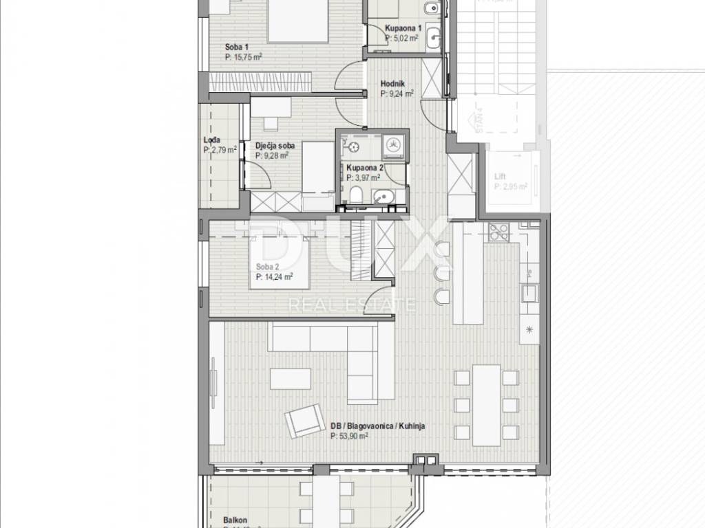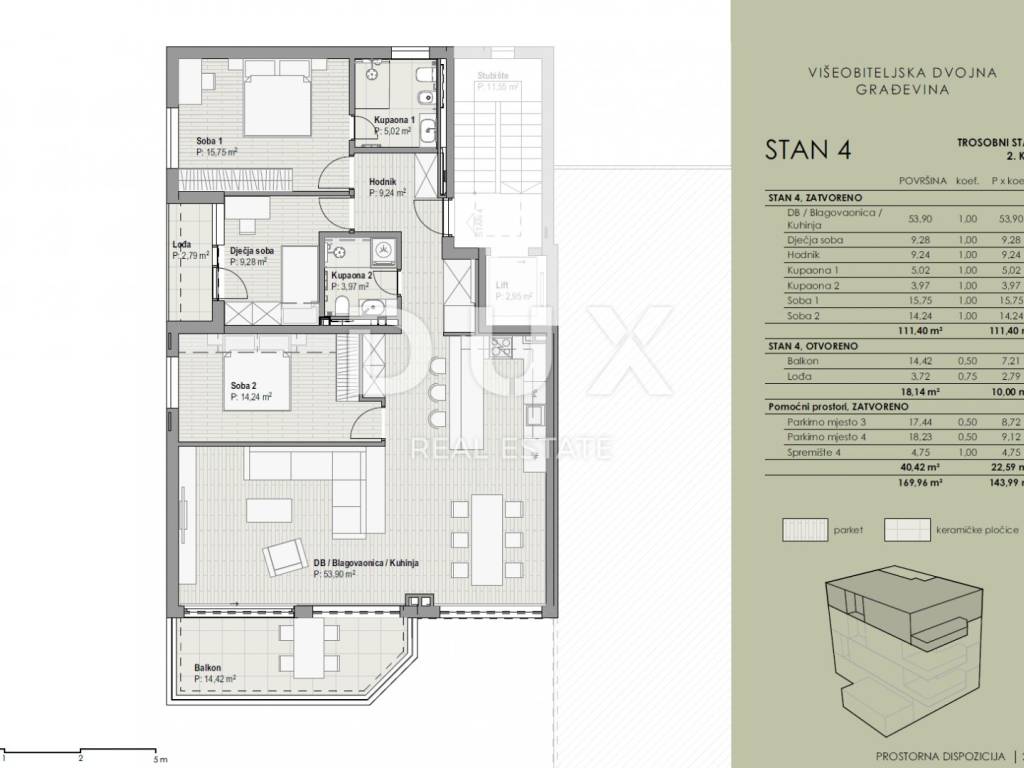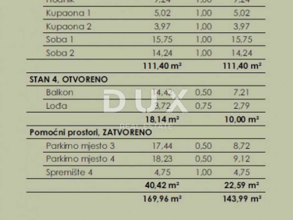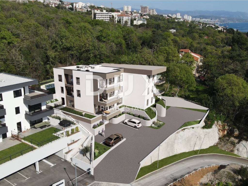 APARTMENT 4 - Three-room apartment, located in the zone of the 2nd floor with a spacious covered balcony and loggia. Auxiliary spaces consist of a separate storage room and 2 closed parking spaces. IDEA OF THE PROJECT: The project represents a vision of housing construction that focuses on modern solutions and quality of life in apartments. DESCRIPTION AND ORGANIZATION: The entire building on its 4 floors accommodates four apartments of different square footage and a basement with garage space. For parking purposes, the majority of parking spaces are located inside the basement floor, which will have been prepared for charging electric cars, i.e. channels for electricity supply have been installed. If the owner of the apartment needs a charging station, all he has to do is run the cables and get the power for electricity. In addition to parking in the basement or on the lot, each apartment is assigned its own storage room. The main entrance to the building is located on the ground floor, which is reached by an external staircase. The apartments are accessed via a communication vertical within which the staircase and elevator are closed. When designing, the investors were guided by the idea that all apartments should have living spaces facing south or west with the possibility of exiting to the outside, to give the apartments maximum privacy and the possibility of a view. They organized the apartments so that the spaces are used as well as possible and suitable for storing wardrobes or other things. Each apartment has a place for a wardrobe in the entrance area, in addition to the spacious wardrobes in all bedrooms. LOCATION: The plot is located in Costabella - Bivio, which is a very attractive location due to its location in relation to Rijeka, Opatija, the proximity of the sea, the ring road and other facilities. The facility is located in the western part of the city of Rijeka. The immediate proximity to the sea within walking distance offers the opportunity to make the most of the summer season, fresh air and a panoramic view of the Kvarner Bay. The location is very well connected with expressways and highways to other parts of the city, Istria, the rest of Croatia and surrounding countries. To the west of the location is Opatija, accessible via the main road directly next to the enclosure. Opatija is famous for being a very famous tourist and therapeutic destination, which is also called the "pearl of the Adriatic coast". Social facilities such as kindergartens, schools, sports halls, and shops are located within a radius of 2 km. This property is 100 meters from the sea as the crow flies, or 1 minute on foot. A property from which you can literally walk to the sea and the beach in one minute! A UNIQUE PROPERTY DEFINITELY WORTH YOUR ATTENTION IN A GREAT LOCATION!!!