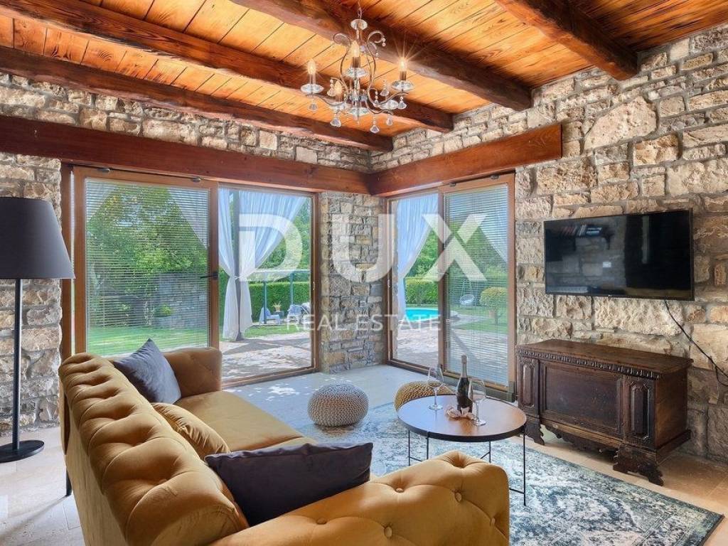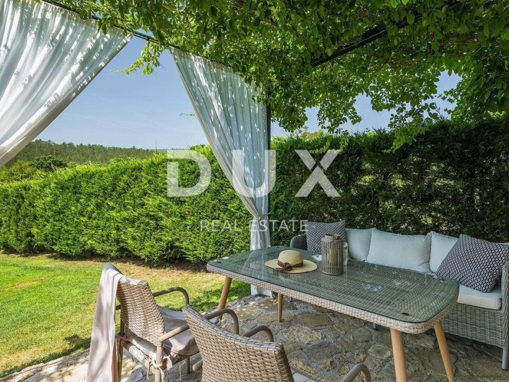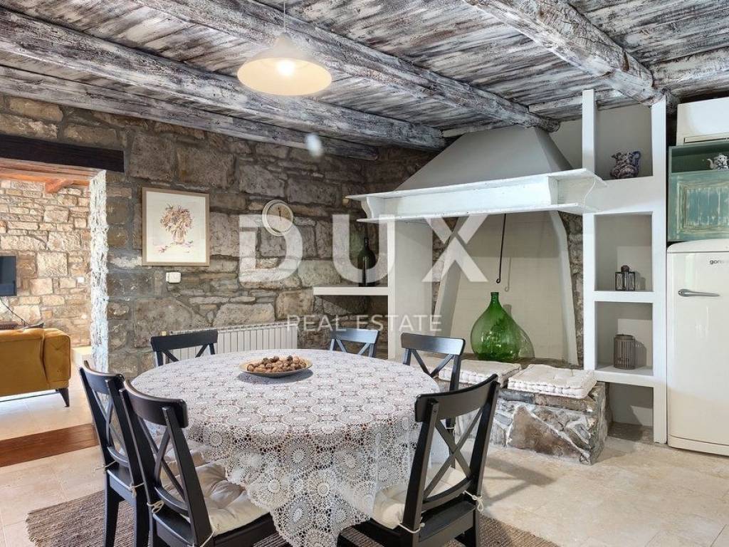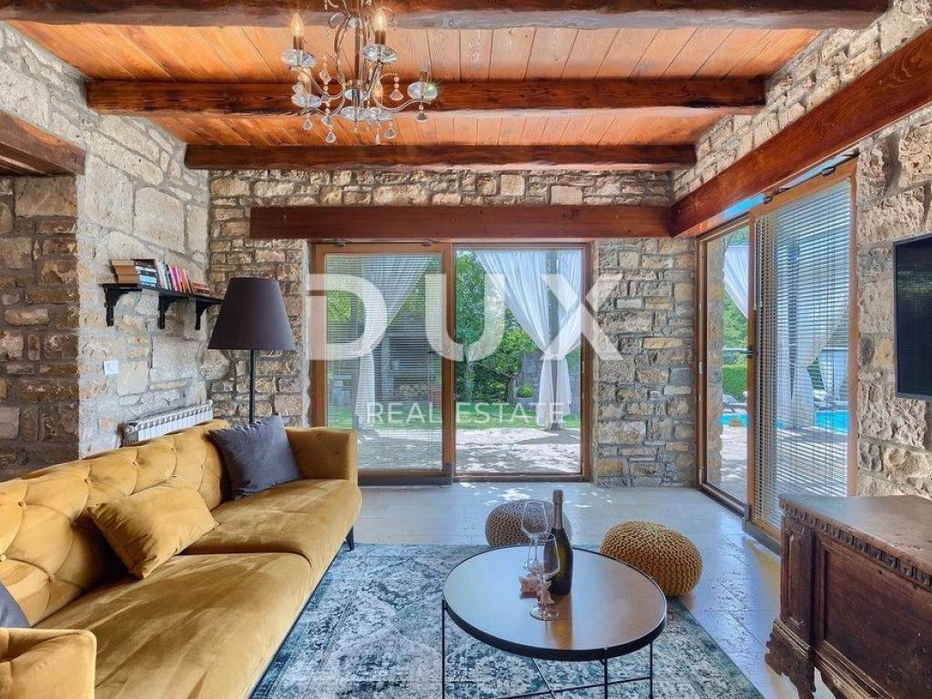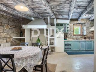 Buzet is a small town on a velvety hill, surrounded by stone walls and seasoned with divine autochthonous Istrian gastronomy. It is widely known as the city of truffles, the sites of which are located precisely in the forests of the Mirna River valley. One of the most valuable features of this region is its untouched nature. Beautiful natural landscapes that merge coastal and mountain landscape with numerous hills and the valley of the Mirna river, give rise to unique views. Not far from Buzet, there is a fantastic rustic, semi-detached villa, suitable for tourist rental. The villa covers an area of 116 m2, was renovated in 2015 and is decorated in a rustic style, thus preserving the traditional values of the former house. The villa covers its surface through the ground floor and first floor. The open space of the ground floor is very bright and airy. It consists of a kitchen, dining room and living room with a beautiful fireplace. Internal stairs lead to the first floor of the villa, where there are two furnished bedrooms, both with private bathrooms. The villa has a large landscaped garden area of 1,070 m2 where there is a 24 m2 swimming pool which is ideal for summer refreshment, then a carefully arranged garden with an outdoor grill and several parking spaces. This villa is perfect for lovers of traditional and rustic style. Opportunity!
