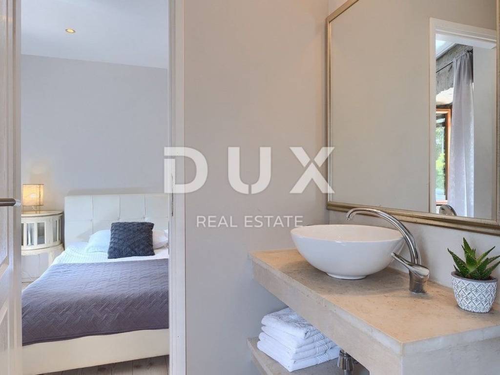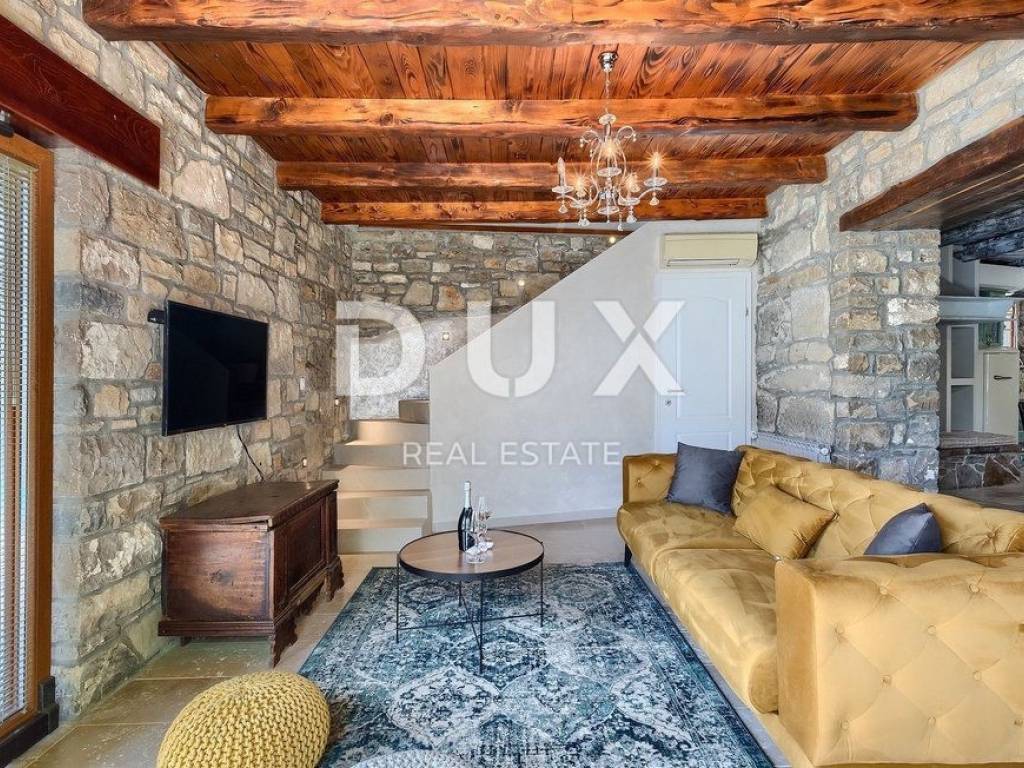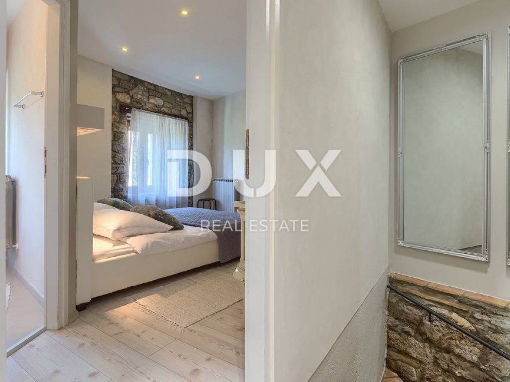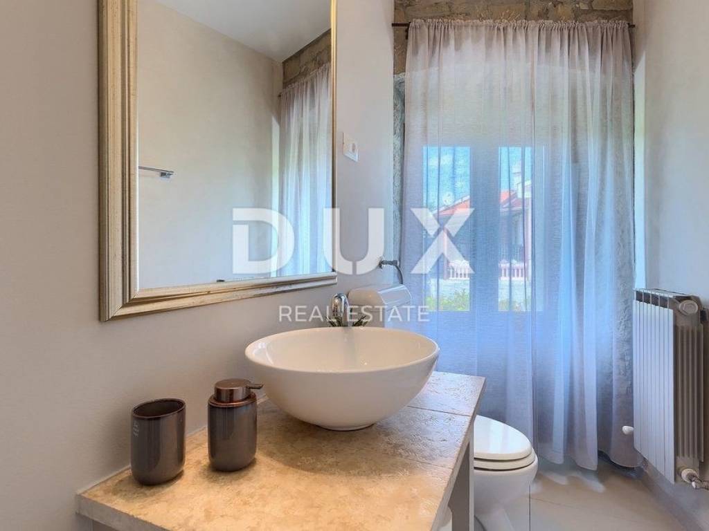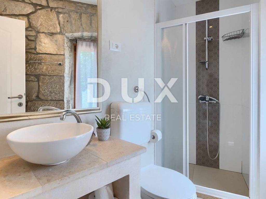 Buzet is a small town on a velvety hill, surrounded by stone walls and seasoned with divine autochthonous Istrian gastronomy. It is widely known as the city of truffles, the sites of which are located precisely in the forests of the Mirna River valley. One of the most valuable features of this region is its untouched nature. Beautiful natural landscapes that merge coastal and mountain landscape with numerous hills and the valley of the Mirna river, give rise to unique views. Not far from Buzet, there is a fantastic rustic, semi-detached villa, suitable for tourist rental. The villa covers an area of 116 m2, was renovated in 2015 and is decorated in a rustic style, thus preserving the traditional values of the former house. The villa covers its surface through the ground floor and first floor. The open space of the ground floor is very bright and airy. It consists of a kitchen, dining room and living room with a beautiful fireplace. Internal stairs lead to the first floor of the villa, where there are two furnished bedrooms, both with private bathrooms. The villa has a large landscaped garden area of 1,070 m2 where there is a 24 m2 swimming pool which is ideal for summer refreshment, then a carefully arranged garden with an outdoor grill and several parking spaces. This villa is perfect for lovers of traditional and rustic style. Opportunity!
