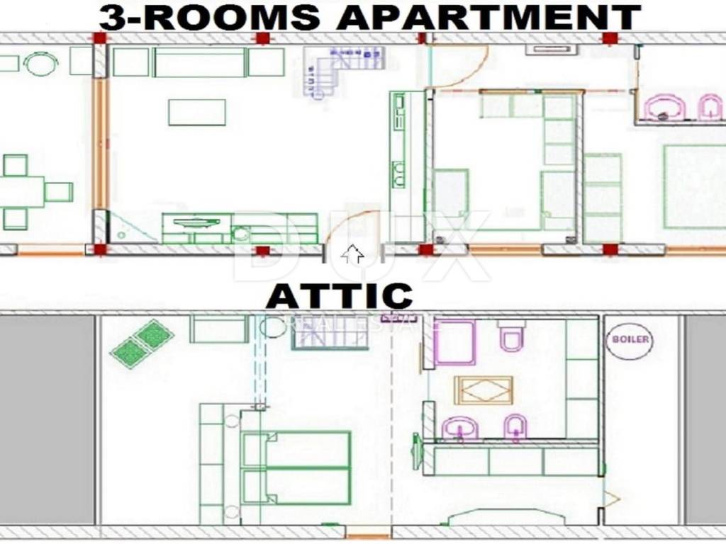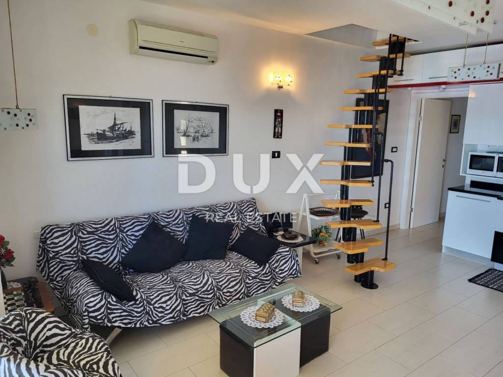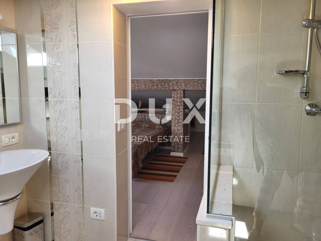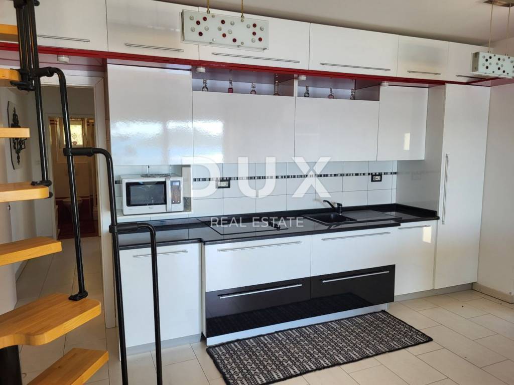 We are selling a two-story apartment with a spacious covered terrace with a beautiful view of the sea and islands. The apartment is located on the second floor and in the high attic of a residential building built in 2011. The apartment extends to 90 m2 and contains two bedrooms, a hallway, a kitchen and a dining room with a living room, a bathroom and a covered terrace of 12 m2 on the first floor. On the second, upper floor in the high attic, there is a bedroom, a work area and a bathroom. Heating and cooling is via air conditioners on each floor. The apartment is fully furnished and is being sold as such. The apartment also has a garage parking space of 19 m2. The distance to the sea and the beach is 200 m. Dear clients, the agency commission is charged in accordance with the General Business Conditions: www.dux-nekretnine.hr/opci-uvjeti-poslovanja