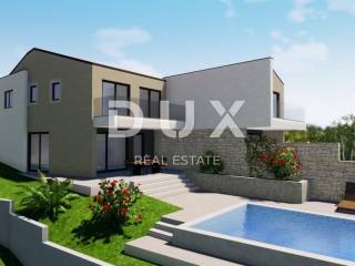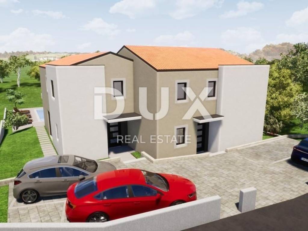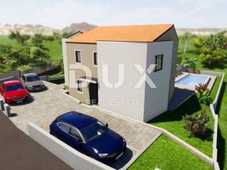 We are offering a modern semi-detached house with an area of 148 m2, which is located in a small and quiet place in the vicinity of Malinska. The house consists of two floors. The ground floor consists of an entrance area, a storage room, a bathroom and an airy open space consisting of a kitchen with a dining room and a living room. The living room has access to a covered terrace and a swimming pool with a sun deck. Upstairs there are three bedrooms, two bathrooms and a covered terrace with a beautiful view of the sea. On the 220 m2 garden there is a 34 m2 swimming pool with a sun deck and two parking spaces. High quality of construction and equipment, and standard equipment includes top-quality ceramics and sanitary ware, underfloor heating and air conditioning. The house is currently under construction, and the planned completion of construction is in 2024. VAT is included in the price, the buyer does not pay real estate sales tax! Dear clients, the agency commission is charged in accordance with the General Terms and Conditions. www.dux-nekretnine.hr/opci-uvjeti-poslovanja