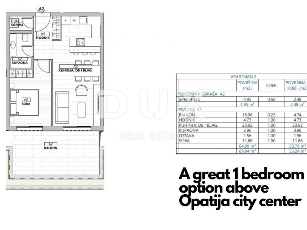 From the Dux offer, we highlight a special new building with 8 luxury apartments near the center of Opatija of top quality. This rare and powerful building in the construction phase of 2023-2024 is located only 250 meters as the crow flies from the sea and Lungomare. The building is located in a quiet side street and offers a panoramic view of the sea. With its easy access to the city center, this home offers an excellent balance between elegant suburban living and the rich array of amenities that the city of Opatija has to offer. Exclusive apartment A2 with a total net size of 64.59m2 - balcony 19m2 (net 5m2) offers a panoramic view of the sea and the center of Opatija. Open space living room with kitchen and dining room 24m2, hallway, bathroom, wardrobe, bedroom facing south. The project is being built on a plot of 1700 m2 and includes a large underground garage, from which the apartment has 3 garage spaces and a large storage room. heating/cooling underfloor heating + heat pump out-of-series construction class, Italian ceramics, branded sanitary ware anti-burglary entrance door Large underground garage with storage Elevator Heated private pool Video surveillance and alarm Panoramic sea view Future Mediterranean horticulture will delight you , while enjoying the silence of a peaceful environment. Perfect investment or opportunity for people looking for 4 walls on the sea CLOSE TO OPATIJA. Walking to the sea takes 7 minutes, or 500 meters on a slightly downhill path. The great advantage of this location is silence, privacy, a view of the sea, the greenery of Učka and the proximity of Opatija. IN THE VAT SYSTEM - the property is owned by the company - the possibility of submitting a request for a VAT refund The price includes 3 garage parking spaces, internal storage. Move-in will be 12/23 UNIQUE OPPORTUNITY FOR NEW BUILDING ON THE OPATIJA RIVIERA!