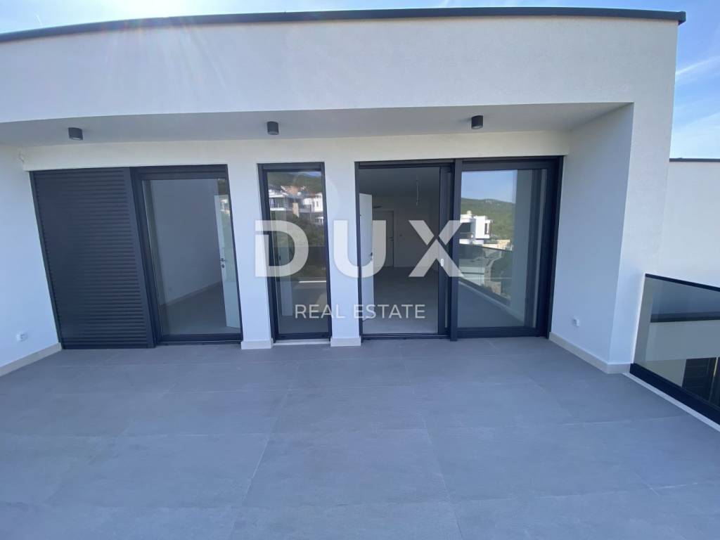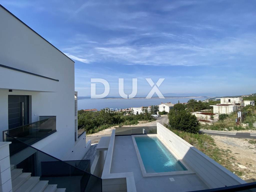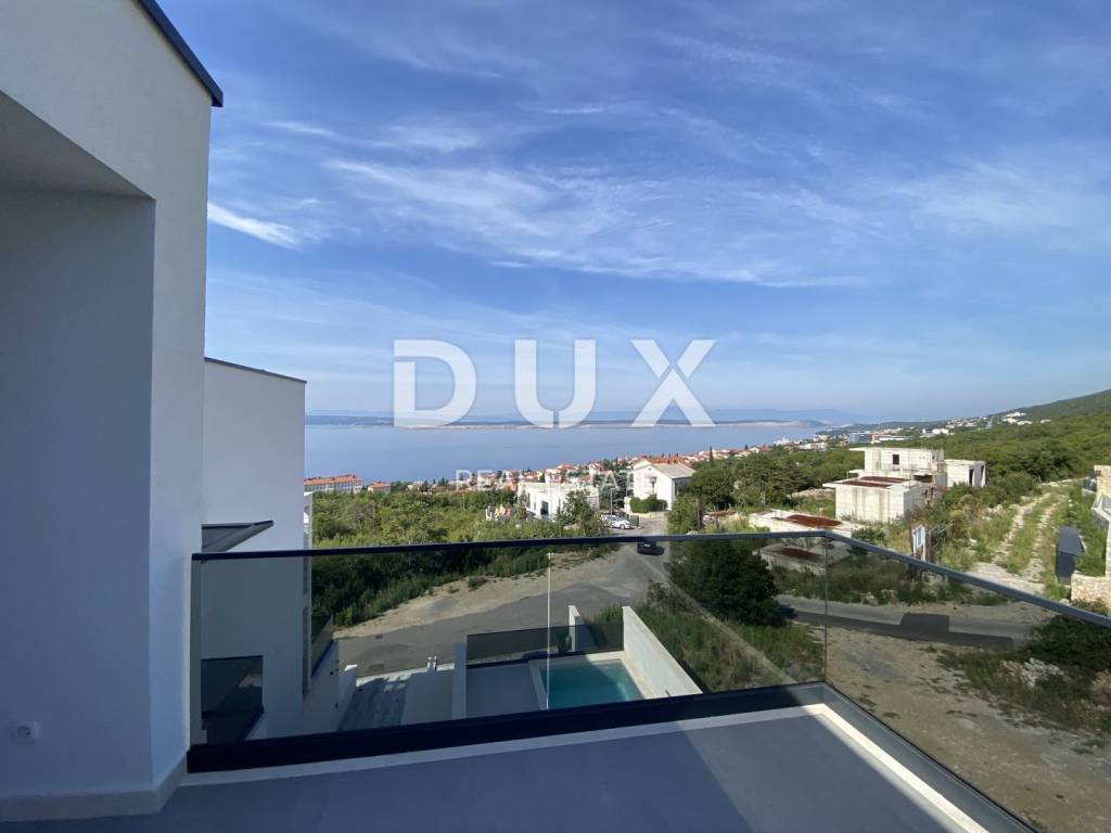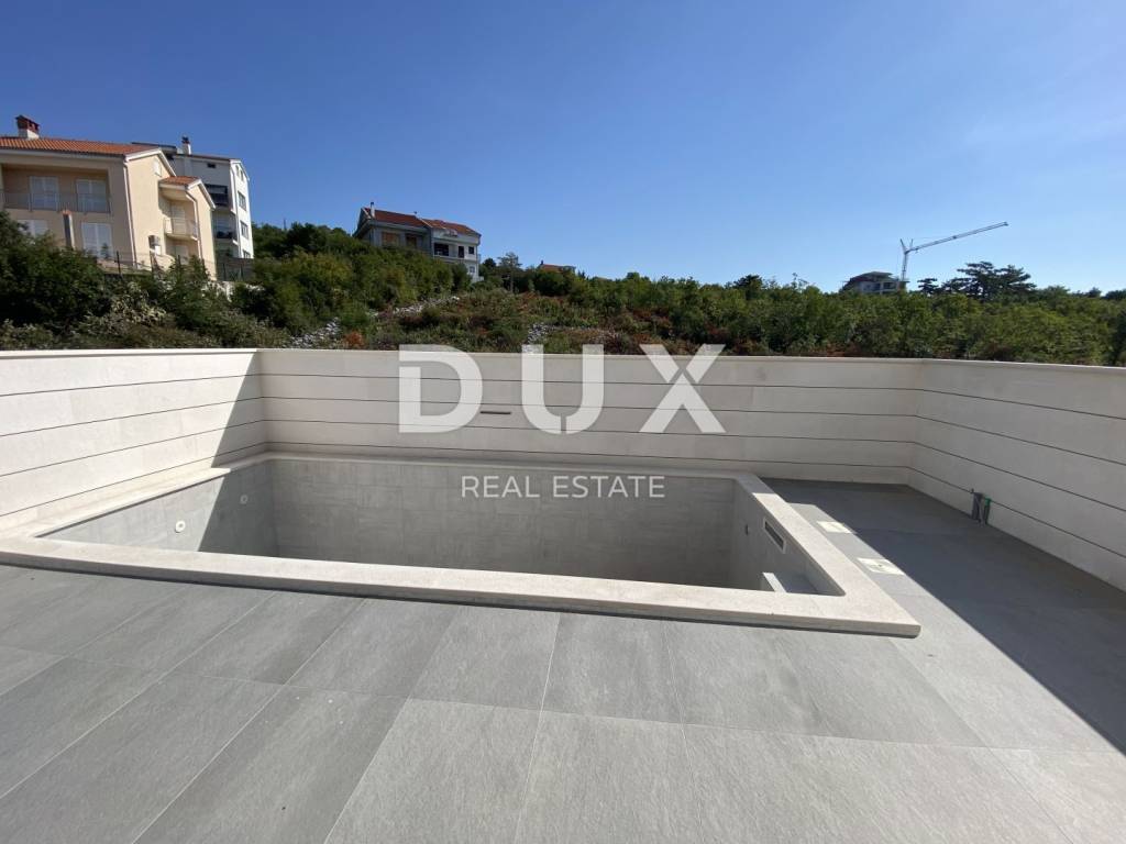 Fascinating multi-apartment building with a unique concept and quality of execution, located ten minutes from the center of Crikvenica and the famous sandy beach of Crikvenica. Located on a hillside in a quiet and peaceful settlement, surrounded by dry stone walls and Mediterranean plants, it offers a phenomenal view of the sea, islands, and the Velebit and Učka mountains. This beautiful two-story apartment has an area of 100 m2 and has its own separate entrance. The first floor consists of an entrance area, a kitchen and a dining room connected to the living room that has access to a beautiful terrace where there is also a private pool, a bedroom with a separate bathroom and a guest toilet. The staircase from the living room leads to the second floor, where there are two comfortable bedrooms, each with its own bathroom and access to a spacious terrace. The apartment has one garage and one outdoor parking space. Equipment of the apartment: - underfloor heating is installed on a heat pump - each room has its own air conditioner. - aluminum windows and glass walls - electric shutters - equipped swimming pool - installed sanitary ware in each toilet - high-quality ceramics - video surveillance of the entire building - anti-burglary door with fingerprint - elevator that goes from the garage The apartment has 100m2 of living space distributed over two floors, net 170m2 with terraces and other rooms and areas, and gross 226m2 total area. There is also the possibility of choosing the design of the internal staircase. Dear clients, the agency commission is charged in accordance with the General Terms and Conditions. https://www.dux-nekretnine.hr/opci-uvjeti-poslovanja