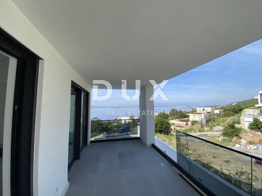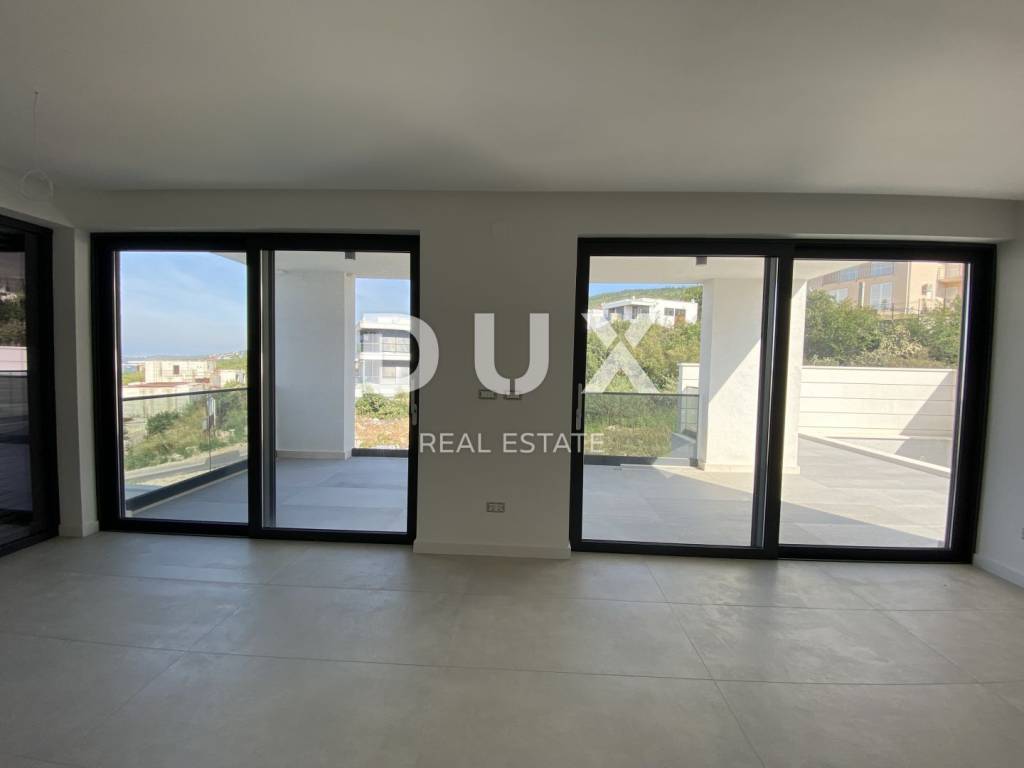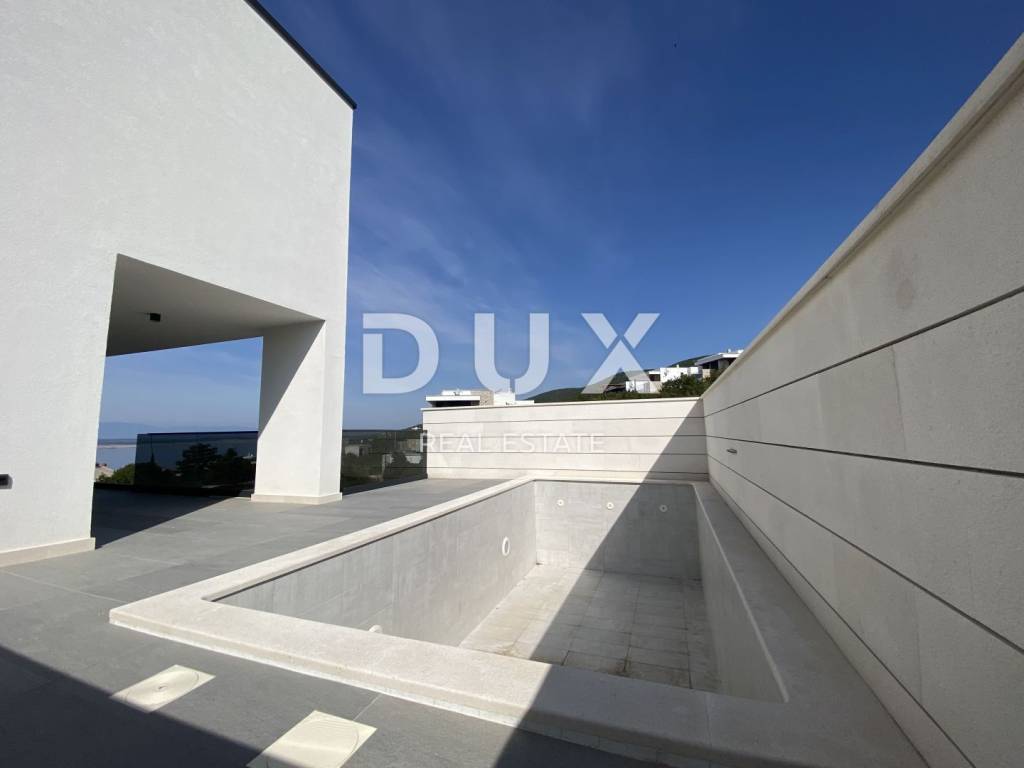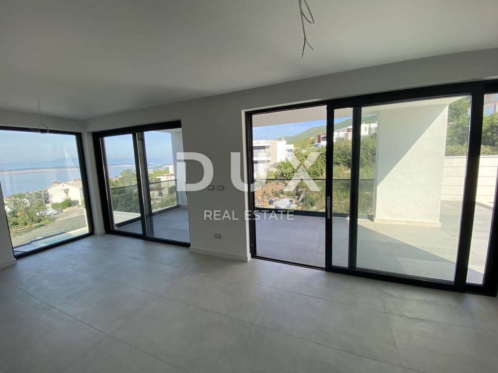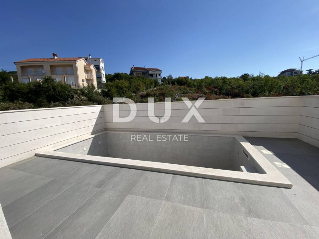 Fascinating multi-apartment building with a unique concept and quality of execution, located ten minutes from the center of Crikvenica and the famous sandy beach of Crikvenica. Located on a hillside in a quiet and peaceful settlement, surrounded by dry stone walls and Mediterranean plants, it offers a phenomenal view of the sea, islands, and the Velebit and Učka mountains. This beautiful two-story apartment has an area of 100 m2 and has its own separate entrance. The first floor consists of an entrance area, a kitchen and a dining room connected to the living room that has access to a beautiful terrace where there is also a private pool, a bedroom with a separate bathroom and a guest toilet. The staircase from the living room leads to the second floor, where there are two comfortable bedrooms, each with its own bathroom and access to a spacious terrace. The apartment has one garage and one outdoor parking space. Equipment of the apartment: - underfloor heating is installed on a heat pump - each room has its own air conditioner. - aluminum windows and glass walls - electric shutters - equipped swimming pool - installed sanitary ware in each toilet - high-quality ceramics - video surveillance of the entire building - anti-burglary door with fingerprint - elevator that goes from the garage The apartment has 100m2 of living space distributed over two floors, net 170m2 with terraces and other rooms and areas, and gross 226m2 total area. There is also the possibility of choosing the design of the internal staircase. Dear clients, the agency commission is charged in accordance with the General Terms and Conditions. https://www.dux-nekretnine.hr/opci-uvjeti-poslovanja