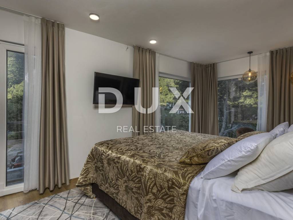 Modern semi-detached villa built in 2022 is located 500 meters from the famous Mošćenička Draga beach. With a contemporary style of construction, it offers 225m2 of living space, while the land area is 455m2, which is quite enough for an arranged oasis of peace. The property consists of 3 bedrooms with en-suite bathrooms, a large open space living room that opens directly to the private pool and its own WELLNESS area with a jacuzzi and sauna. The green surroundings, close proximity to the beach, sea view, and garden are the advantages that highlight this house on the market. The house is decorated with custom-made designer furniture, and the emphasis is on open space and glass walls oriented towards the sea. 10cm facade insulation, top-quality parquet, luxurious curtains, well-maintained garden with exotic plants, a piece of garden, private fenced parking, alarm system, video surveillance, heated swimming pool of 30m2. The house is a perfect opportunity, especially as an investment for companies or individuals for the purpose of tourist rental. The villa is decorated to a 5-star categorization standard, and with the mediation of this house, consultations regarding further renting in the future are possible (care for the entire facility, property management, property rental). A rarity on the market, - an excellent investment that can be rented carefree through a property manager.