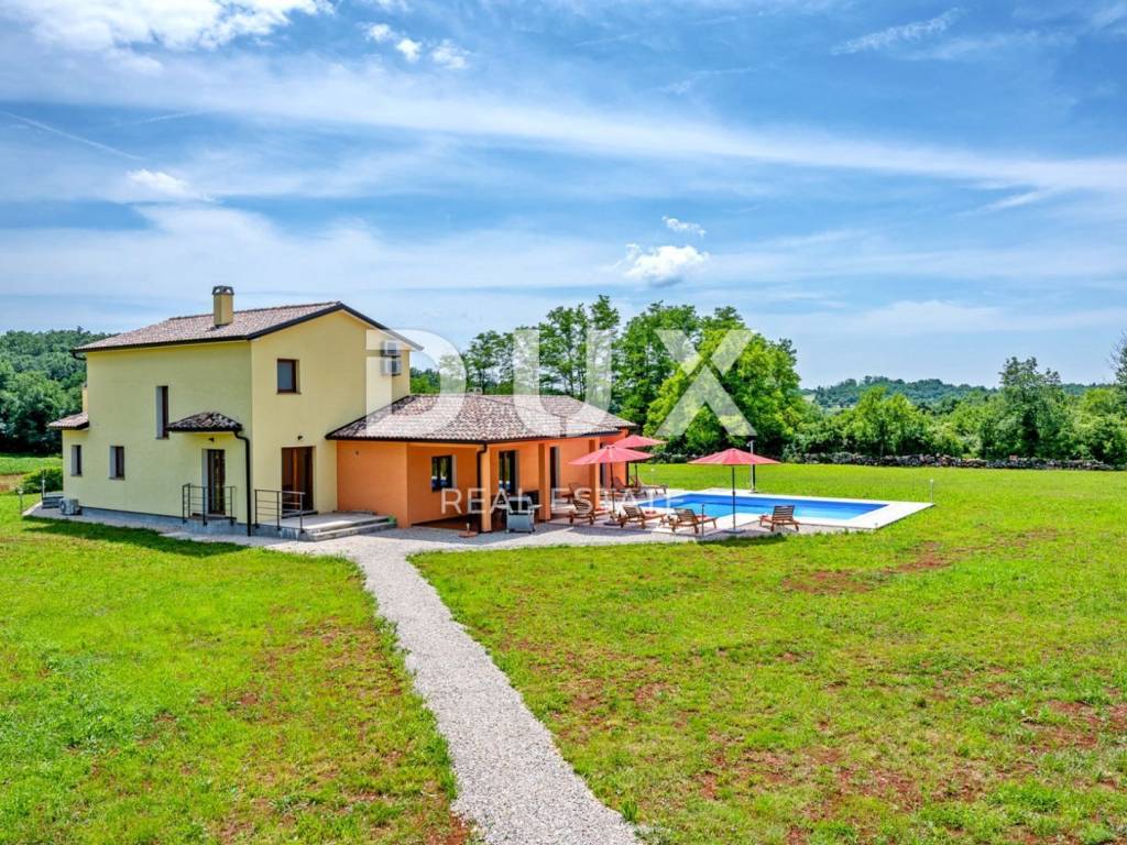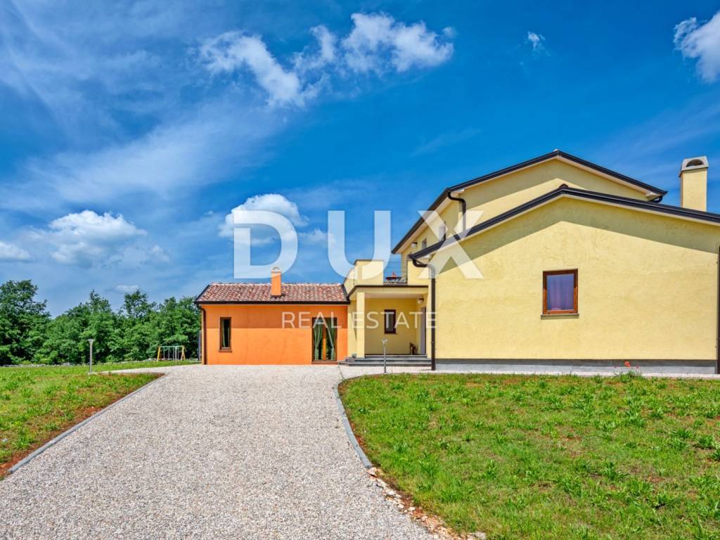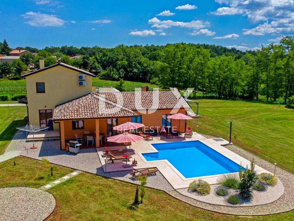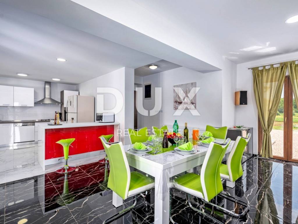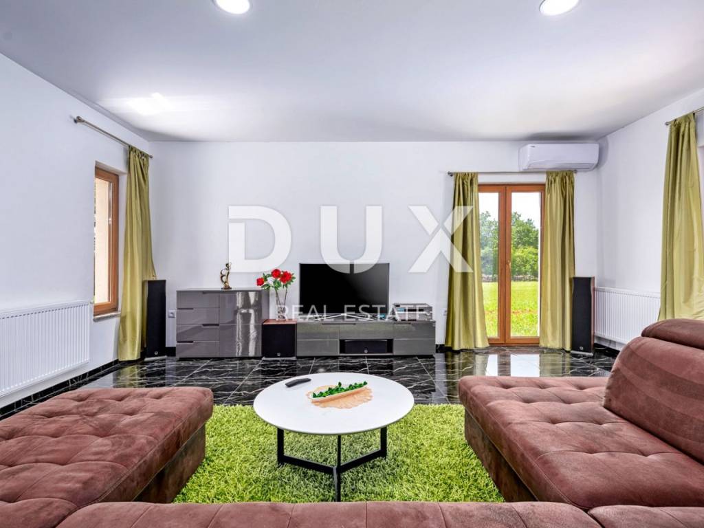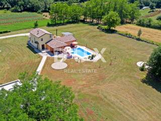 In a quiet village 8 km away from Tinjan is this charming house on a spacious property of 11500m2. The house of 280m2 has two residential units and is decorated with quality furniture. The interiors are bright and modern. One unit consists of a spacious living room, dining room and open kitchen with direct access to a covered terrace of 20m2 and a pool of 50m2. On the ground floor there is one double bedroom and a separate bathroom. On the first floor there are two comfortable and spacious bedrooms, each with its own bathroom and exit to the terrace. The second unit is an apartment consisting of a kitchen with dining area and living room, a bedroom and a bathroom. In addition, on the property there is another building within which we have another two bedroom apartment and garage, swimming pool with sun deck, barbecue and children's playground. Ideal place for relaxation and family life.