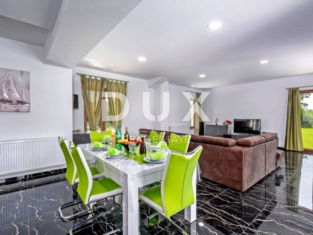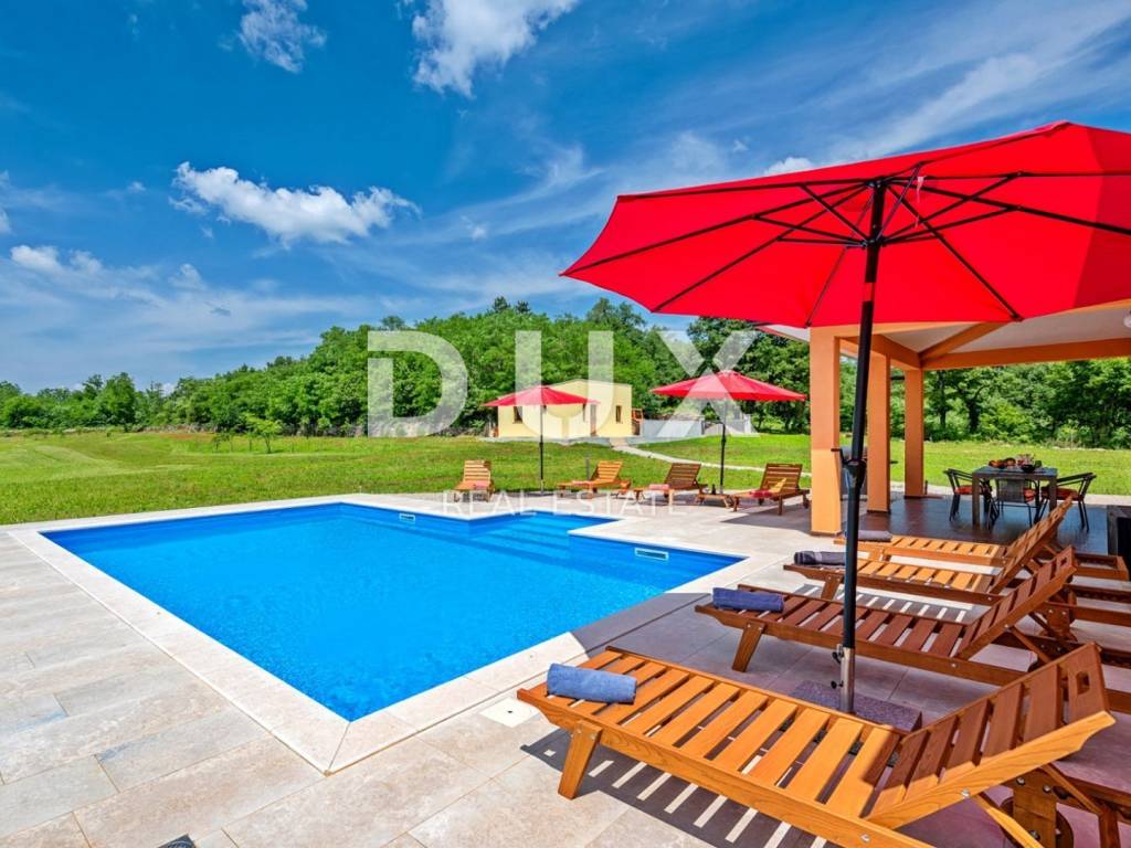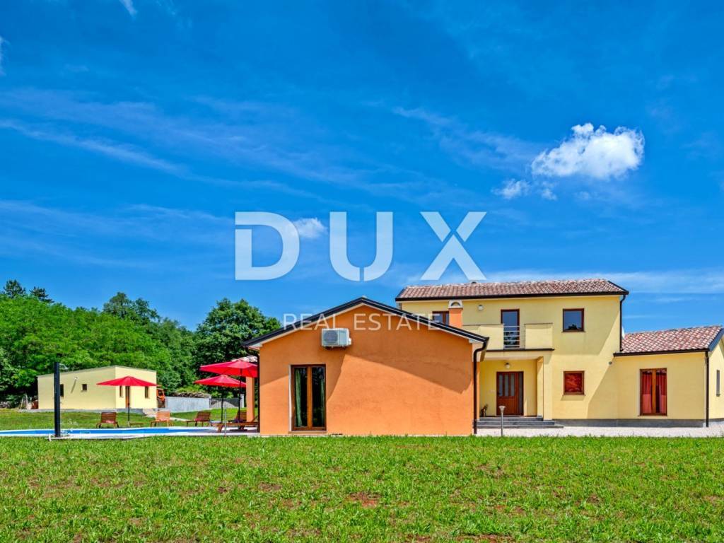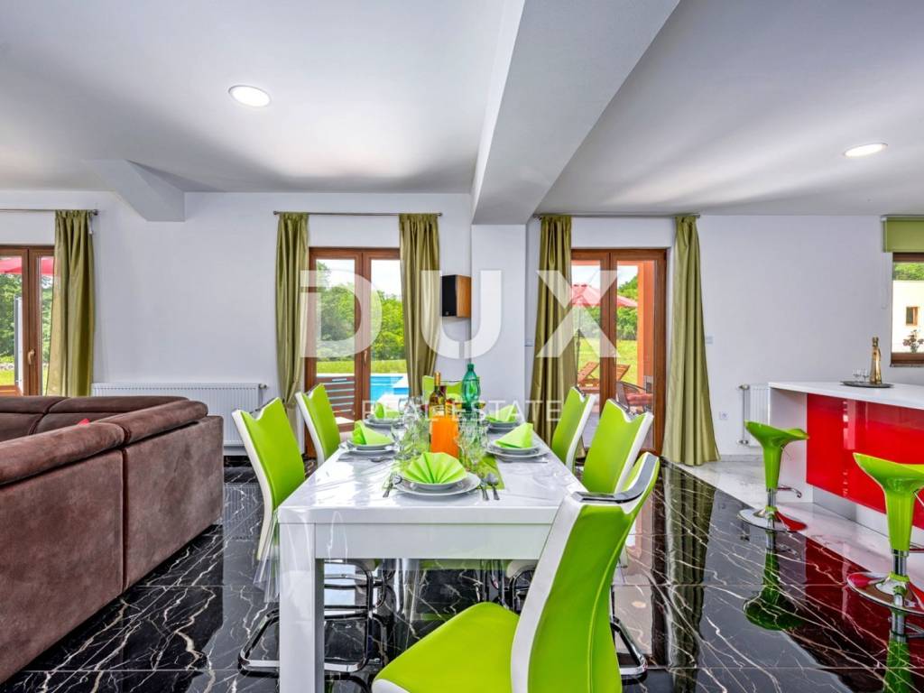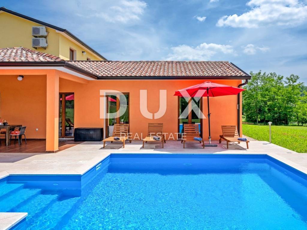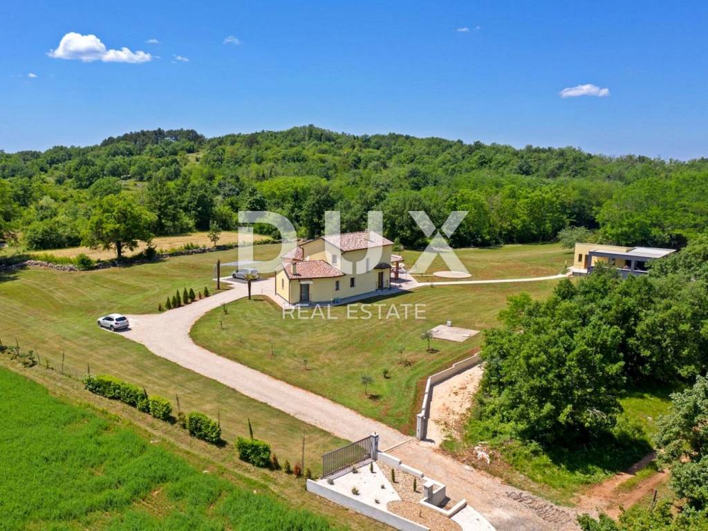 In a quiet village 8 km away from Tinjan is this charming house on a spacious property of 11500m2. The house of 280m2 has two residential units and is decorated with quality furniture. The interiors are bright and modern. One unit consists of a spacious living room, dining room and open kitchen with direct access to a covered terrace of 20m2 and a pool of 50m2. On the ground floor there is one double bedroom and a separate bathroom. On the first floor there are two comfortable and spacious bedrooms, each with its own bathroom and exit to the terrace. The second unit is an apartment consisting of a kitchen with dining area and living room, a bedroom and a bathroom. In addition, on the property there is another building within which we have another two bedroom apartment and garage, swimming pool with sun deck, barbecue and children's playground. Ideal place for relaxation and family life.