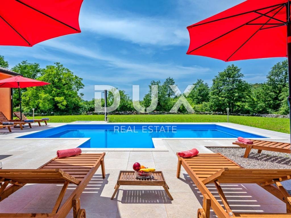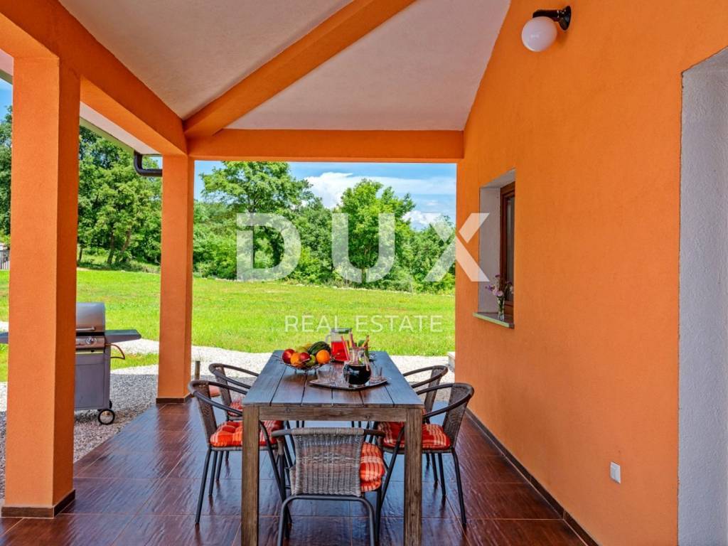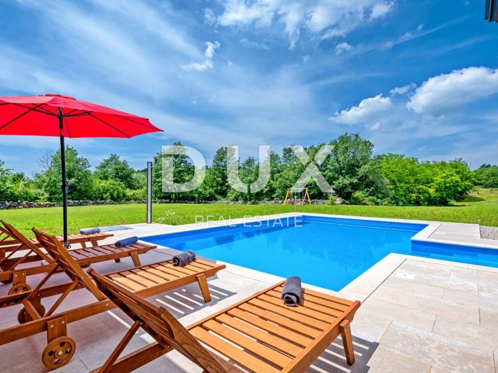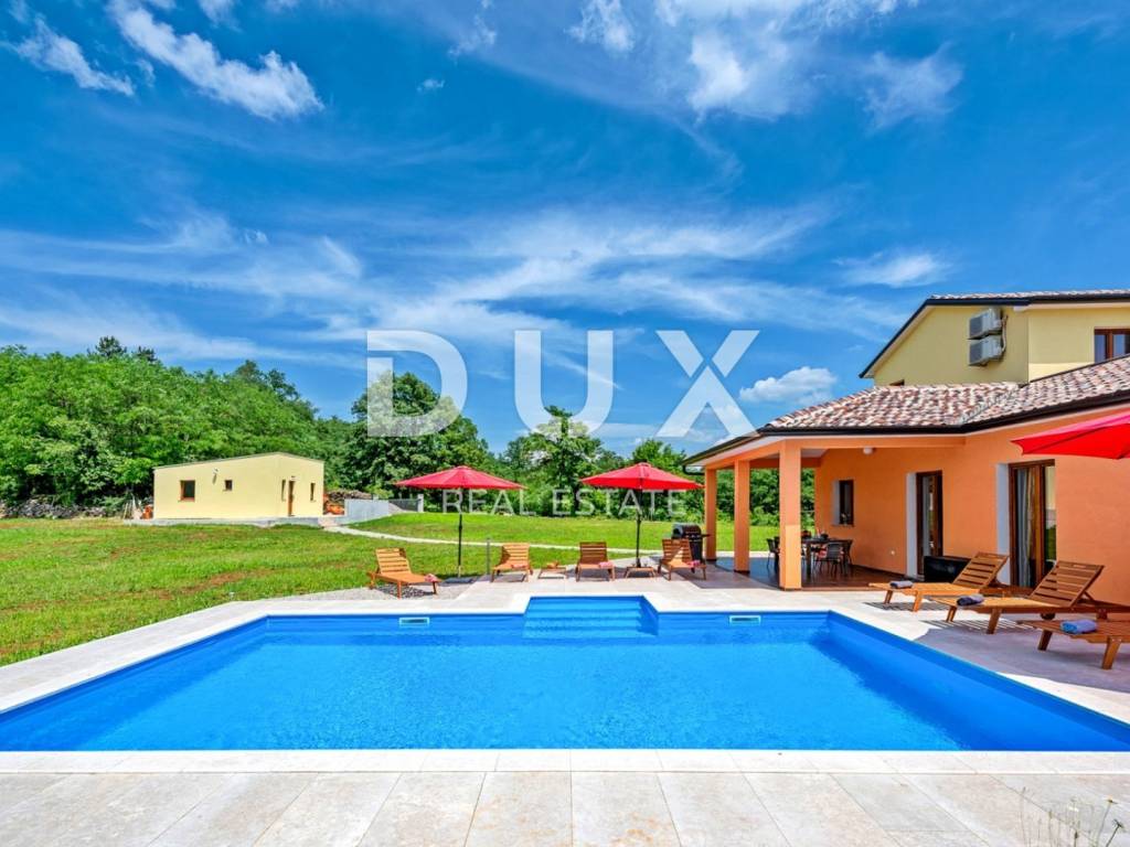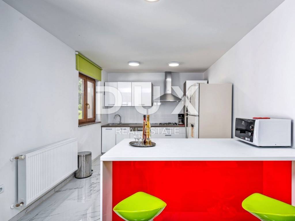 In a quiet village 8 km away from Tinjan is this charming house on a spacious property of 11500m2. The house of 280m2 has two residential units and is decorated with quality furniture. The interiors are bright and modern. One unit consists of a spacious living room, dining room and open kitchen with direct access to a covered terrace of 20m2 and a pool of 50m2. On the ground floor there is one double bedroom and a separate bathroom. On the first floor there are two comfortable and spacious bedrooms, each with its own bathroom and exit to the terrace. The second unit is an apartment consisting of a kitchen with dining area and living room, a bedroom and a bathroom. In addition, on the property there is another building within which we have another two bedroom apartment and garage, swimming pool with sun deck, barbecue and children's playground. Ideal place for relaxation and family life.