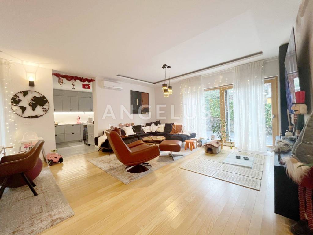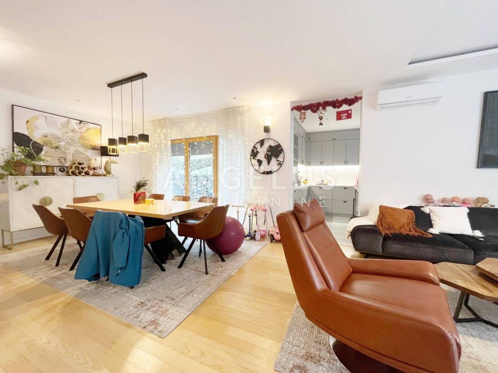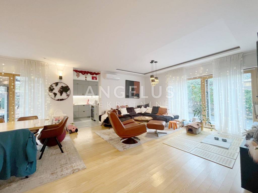 The apartment is located on the ground floor of the building with 2 floors with an elevator, and consists of: entrance hall, 3 bedrooms, 2 terraces (14.12 m2, 33.11 m2 and 11.51 m2), 2 bathrooms, toilet, separate kitchen, living room with exit to north (22.33 m2 and 4.60 m2) and west garden (27.90 m2). if needed, it is possible to make the 4th bedroom in the place of the current dining room, where instalations already exist.The price includes equipped kitchen and built-in wardrobes, and it has a garage (23.46 m2) and a storage room in the basement. The building was finished in 2019. Gas central heating, air conditioning, wood-aluminum joinery.