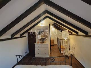 From the first floor, internal stairs lead to the attic, where there is another bedroom with a bathroom. In the attic, wooden beams on the roof are highlighted, which make the whole space special.