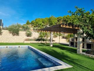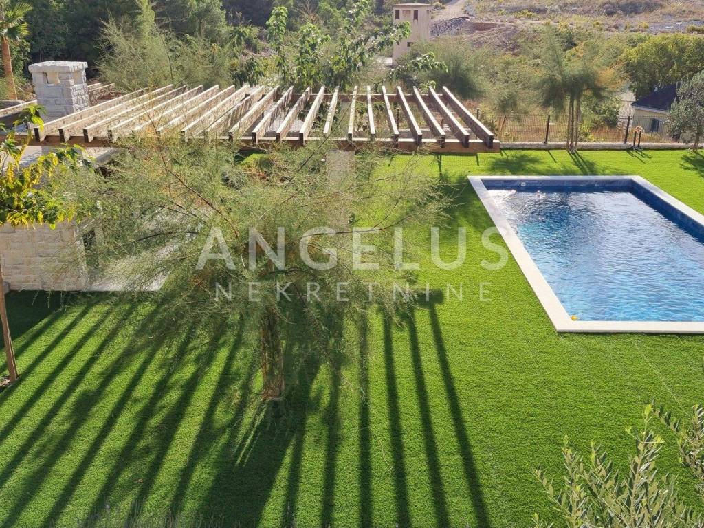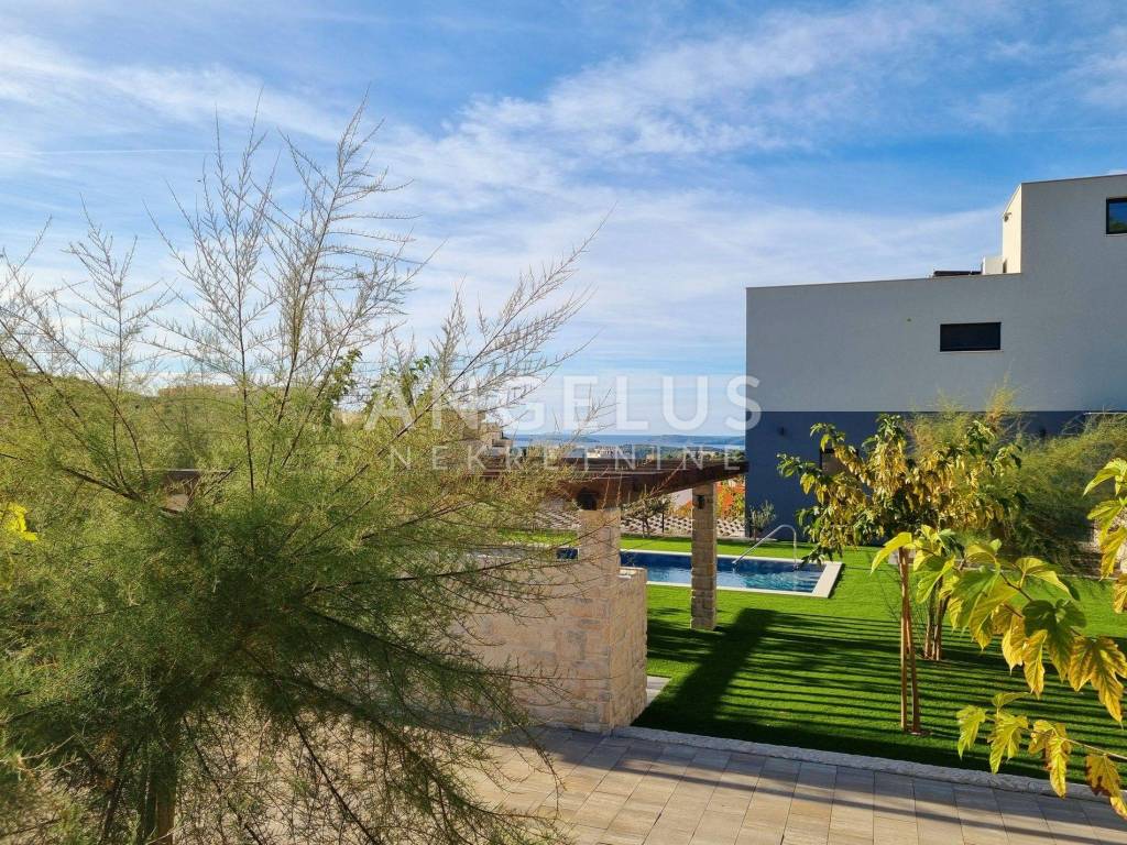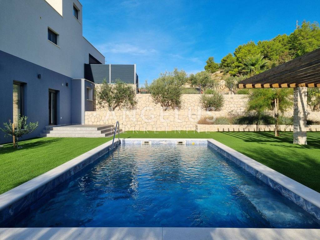 A beautiful, luxurious four-room apartment with a total net area of 196.56 m2 is for sale (in nature, the apartment has 234.73 m2). The apartment has a yard of 488 m2 with a swimming pool and barbecue. The apartment is located on the first floor of a beautiful urban villa with a view of the sea, which has a total of 2 apartments. It consists of an entrance hall, a kitchen and a dining room with a living room, four bedrooms, two bathrooms, a toilet and a large covered terrace with a beautiful view of the city, the sea and the nearby islands. The apartment has two parking spaces in the garage, from which the apartment can be reached directly with the elevator.