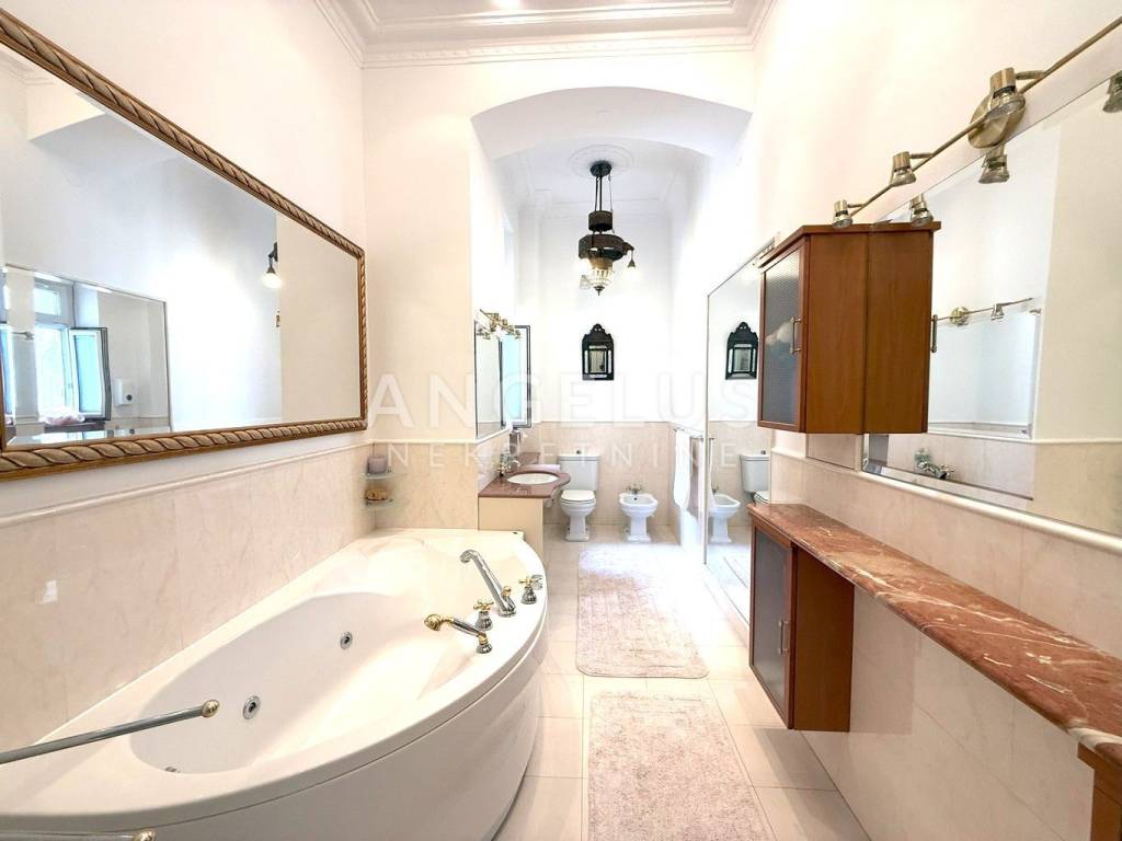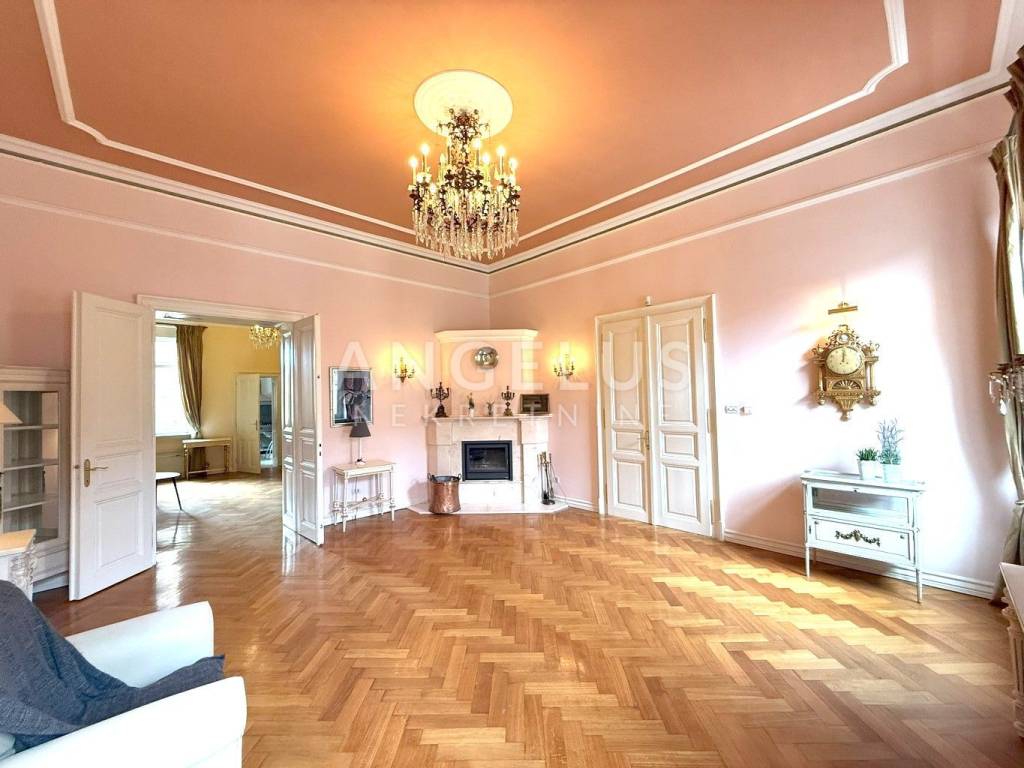 DESCRIPTION: The apartment (202m2) is located on the 2nd floor of a residential building with only 3 tenants. The apartment has 2 entrances, consists of a representative entrance hall, two lounge rooms oriented north towards the street, two large lounge rooms, oriented towards the south, one of which has a large balcony, kitchen, smaller rooms and two large bathrooms oriented towards the east, and a closed loggia oriented towards the west. The apartment is now divided into a smaller part (living room, kitchen with dining room, bedroom and bathroom) - the original entrance hall and lounge room oriented to the north, and the remaining part. Opening the door returns to the original described section. The apartment also has a living space of 71 m2 (not split) on the 3rd floor, fully furnished, consisting of an entrance hall, a living room with a kitchen and a bedroom. In addition, there is a storage room in the basement of 22 m2.