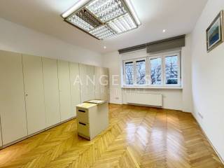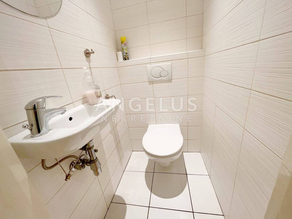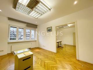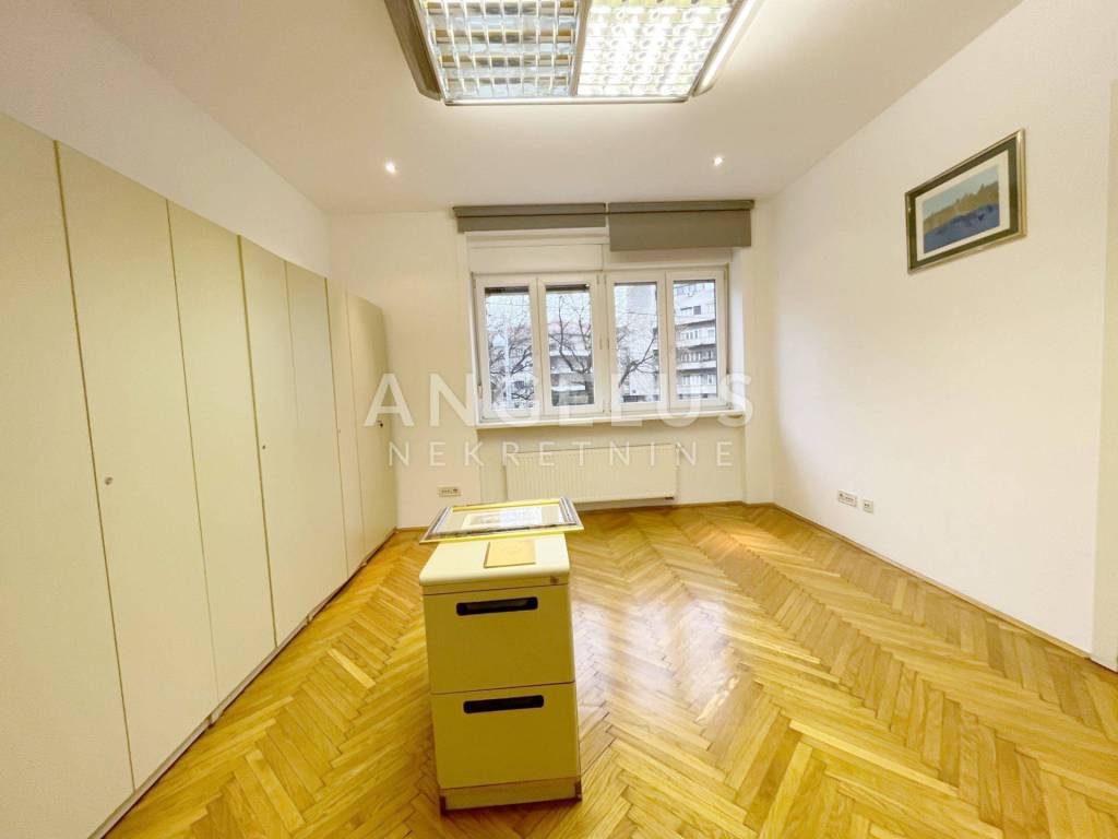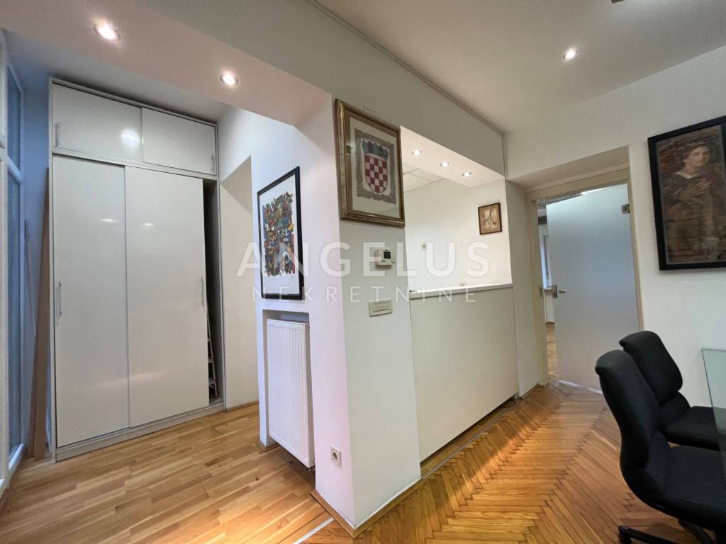 Nalazi se na prvom katu dobro održavane zgrade bez lifta, a sastoji se od: ulaznog prostora, prostorije pogodne za recepciju, tri sobe, kuhinje, 2 kupaonice, toaleta i 2 balkona. Plinsko centralno grijanje, klimatizirano, djelomično namješteno.